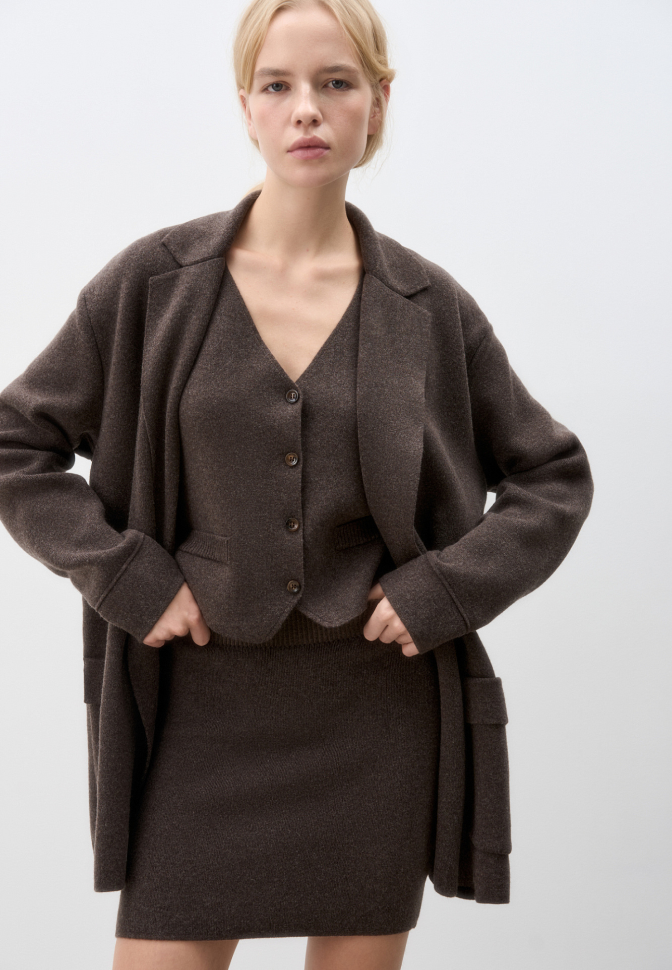 Трикотажный двубортный жакет из смесовой шерсти с добавлением кашемира. Модель прямого кроя, с прямоугольными лацканами и накладными карманами с клапанами спереди. Изделие без подкладки.