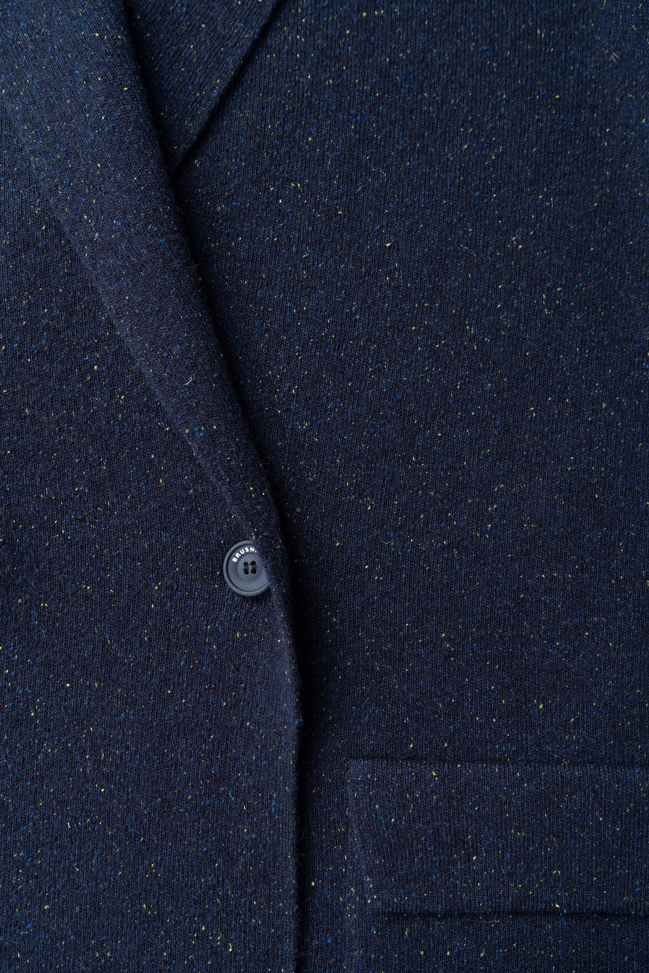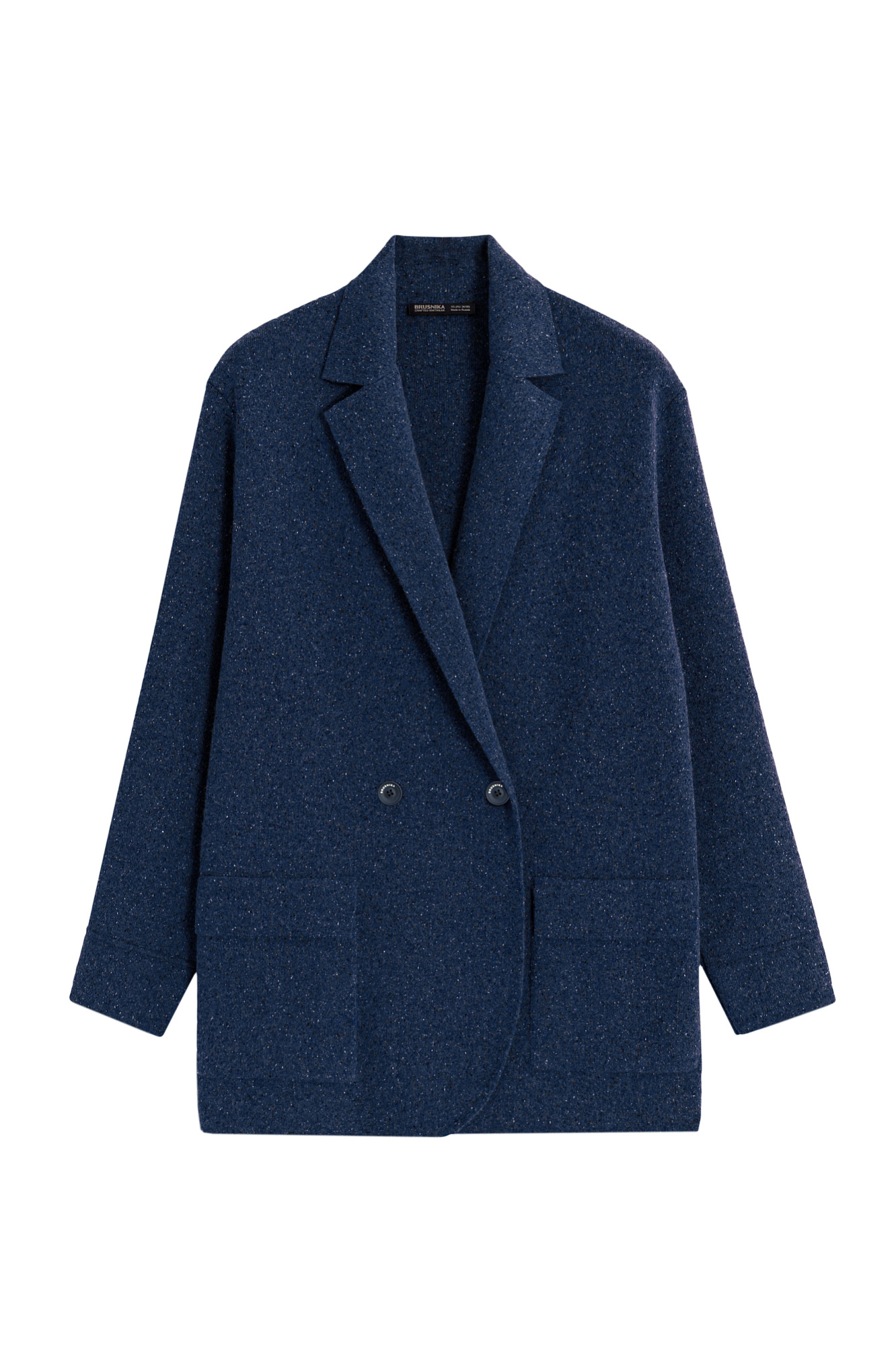 Трикотажный двубортный жакет из шерсти с добавлением вискозы и шелка. Модель прямого кроя, с лацканами, двумя накладными карманами и валиками на манжетах. Застежка на пуговицы. Без подкладки.