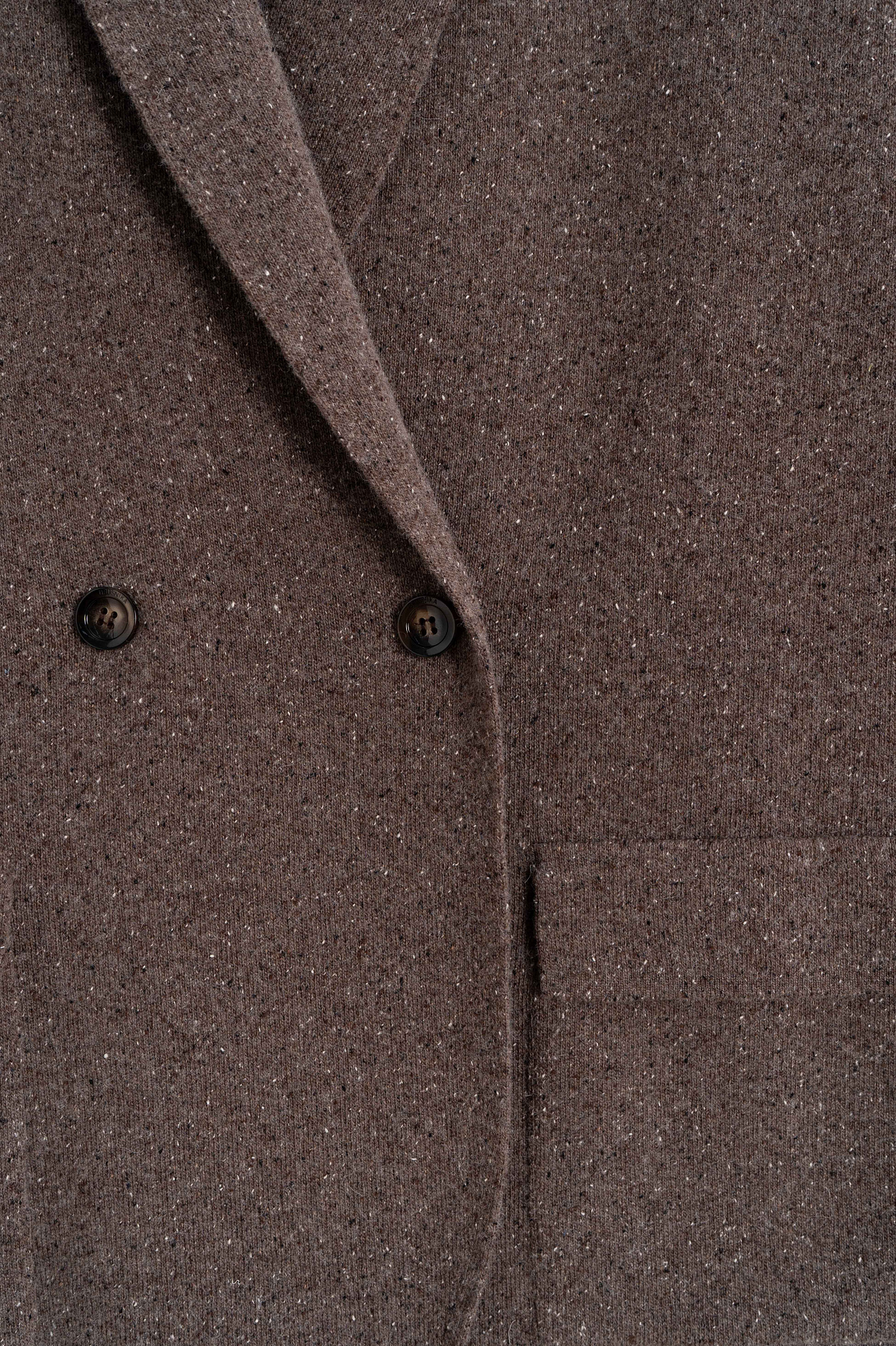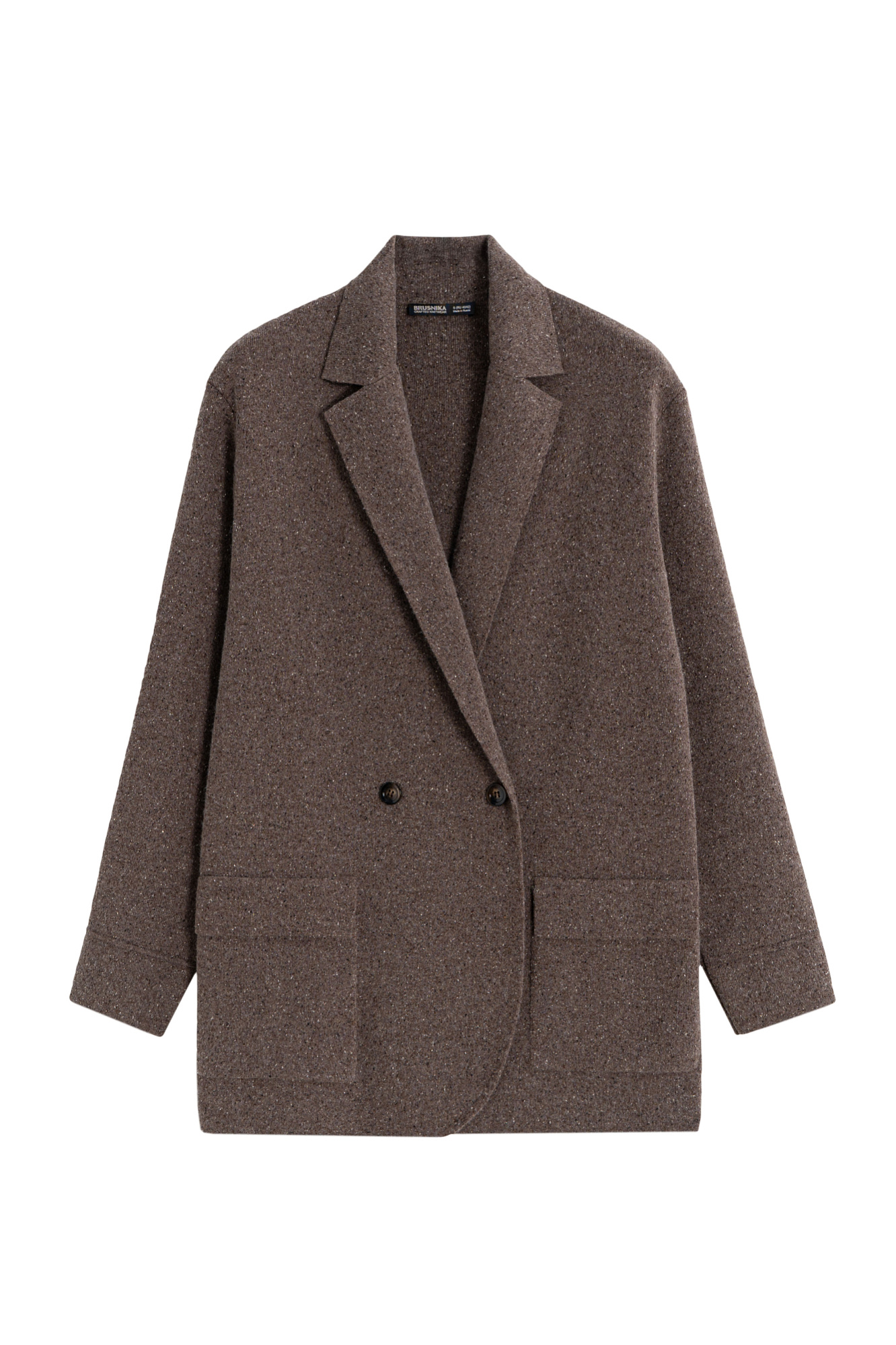 Трикотажный двубортный жакет из шерсти с добавлением вискозы и шелка. Модель прямого кроя, с лацканами, двумя накладными карманами и валиками на манжетах. Застежка на пуговицы. Без подкладки.
