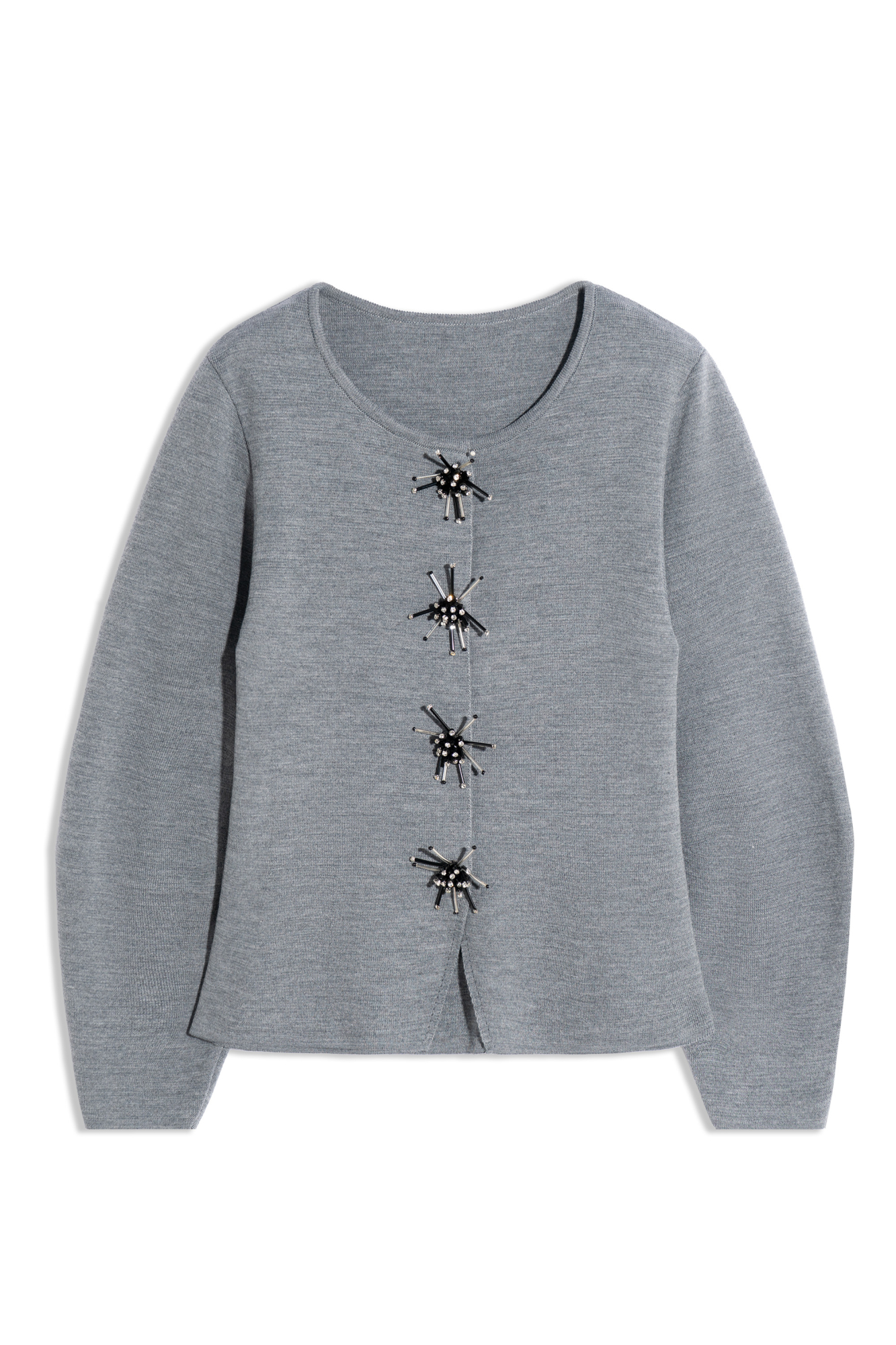 Трикотажный жакет из шерсти. Модель свободного силуэта с широкими рукавами и круглым вырезом горловины без лацканов. Застежка на магнитные кнопки. Изделие декорировано аппликацией из стекляруса и страз.