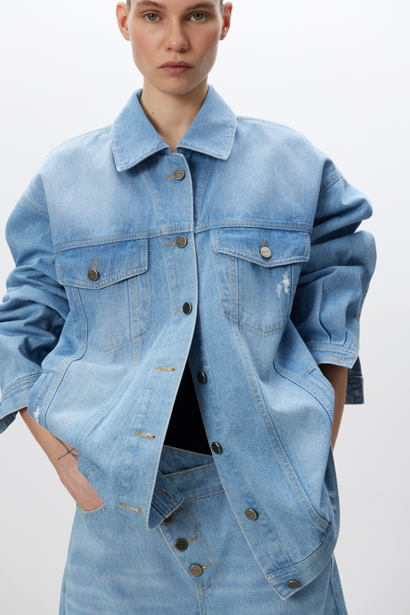 Джинсовый жакет из 100% хлопка. Модель прямого кроя, с отложным воротником, длинными рукавами с манжетами на пуговицах. Изделие декорировано накладными карманами на груди и боковыми карманами спереди. Застежка на пуговицы.