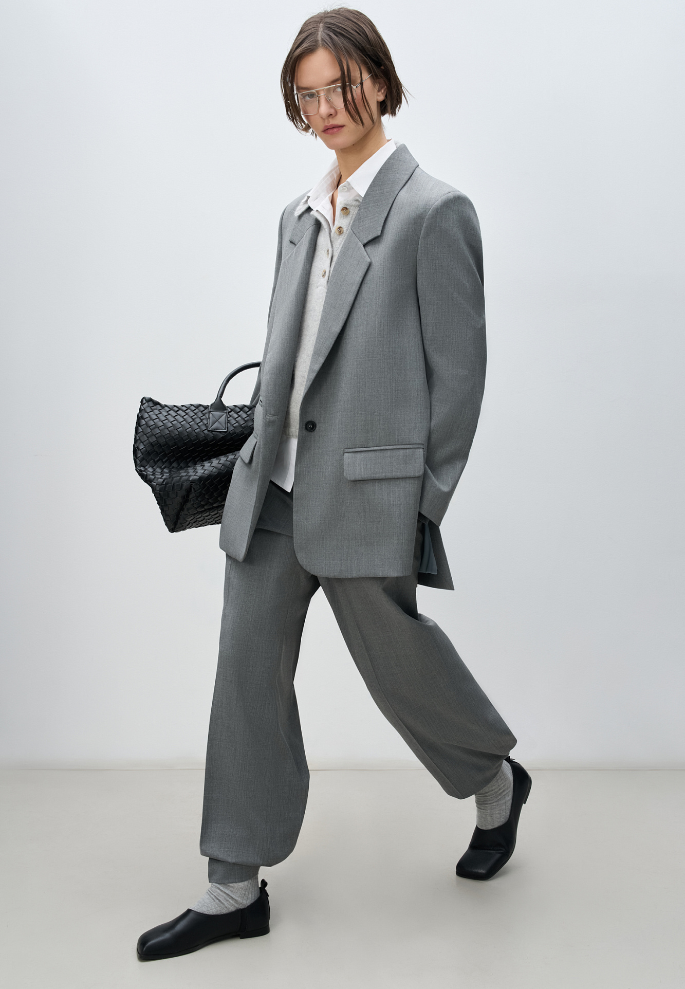 Классический жакет с накладными карманами, подплечниками, разрезами по бокам и удлиненной спинкой. Длинные рукава на манжетах без пуговиц. Застежка на пуговицу.