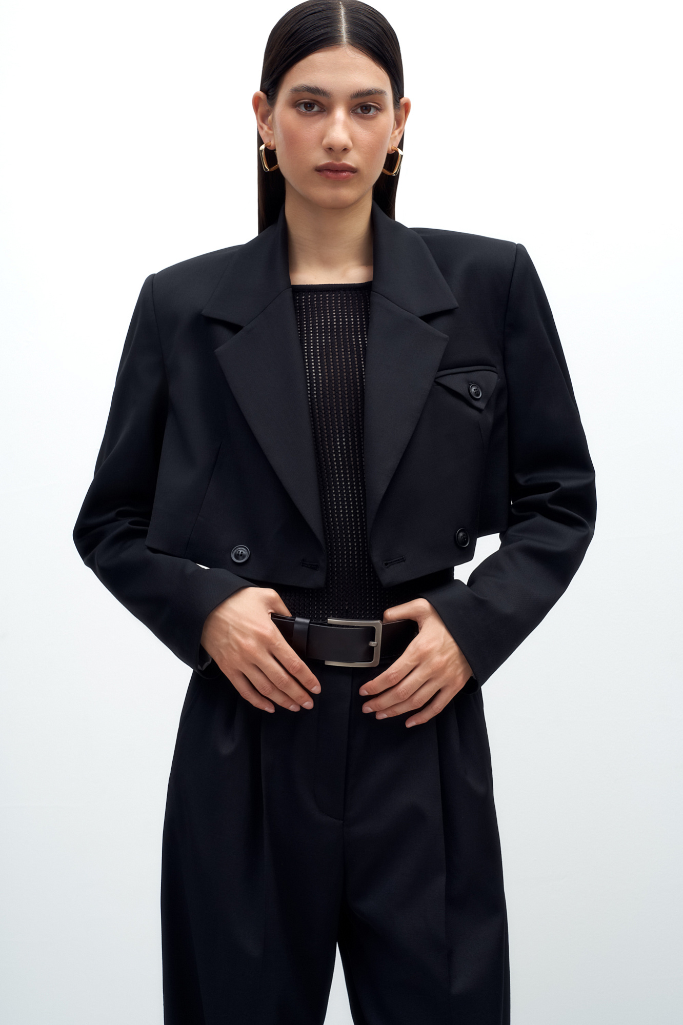 Укороченный жакет из смесовой шерсти. Длинные рукава, декоративный карман на груди и застежка на две пуговицы. На подкладке. Дополнить образ можно брюками из такого же материала.