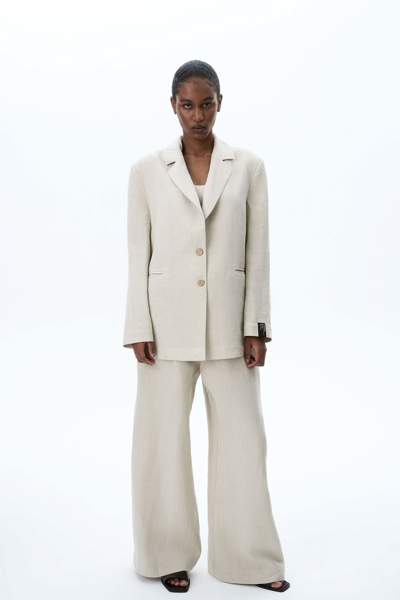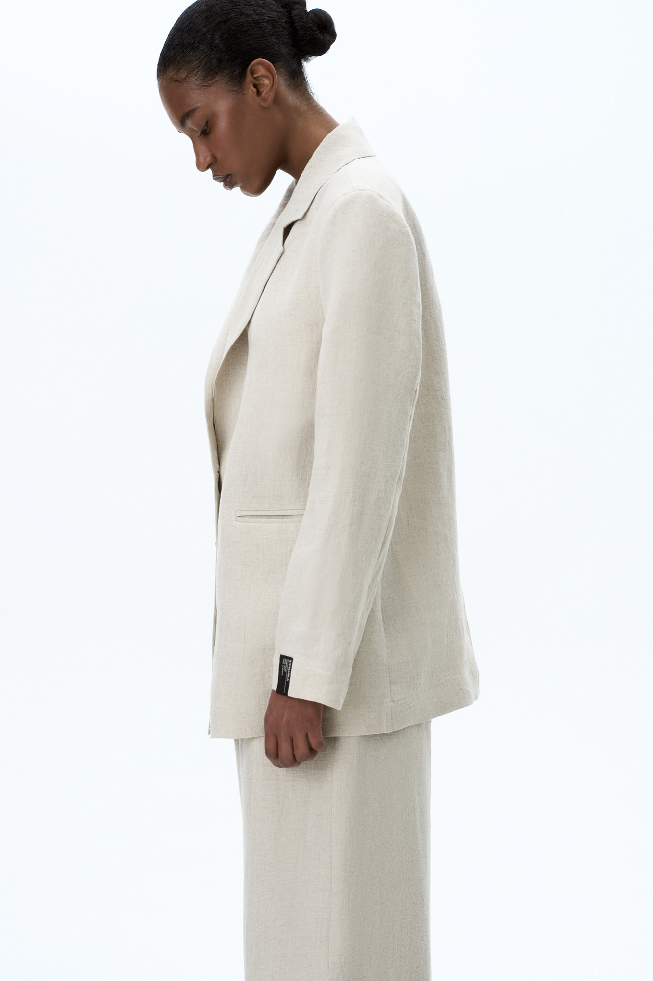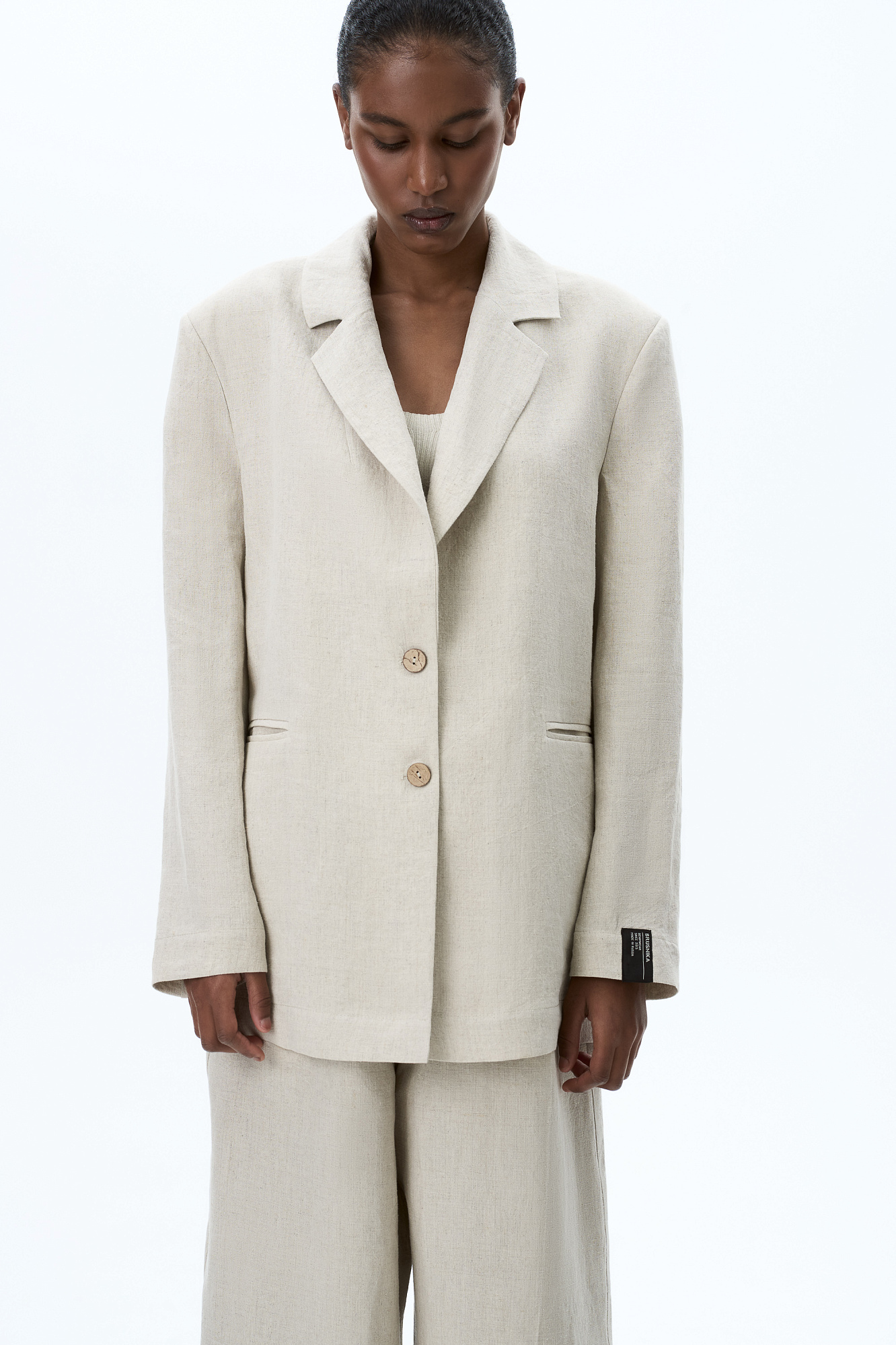 Однобортный жакет, выполненный из конопляной ткани. Модель прямого кроя, передние карманы с клапанами и брендированный ярлык на рукаве. Использование конопляной ткани придает изделию особую прочность и износостойкость, а натуральное происхождение подчеркивает экологичность данной модели.