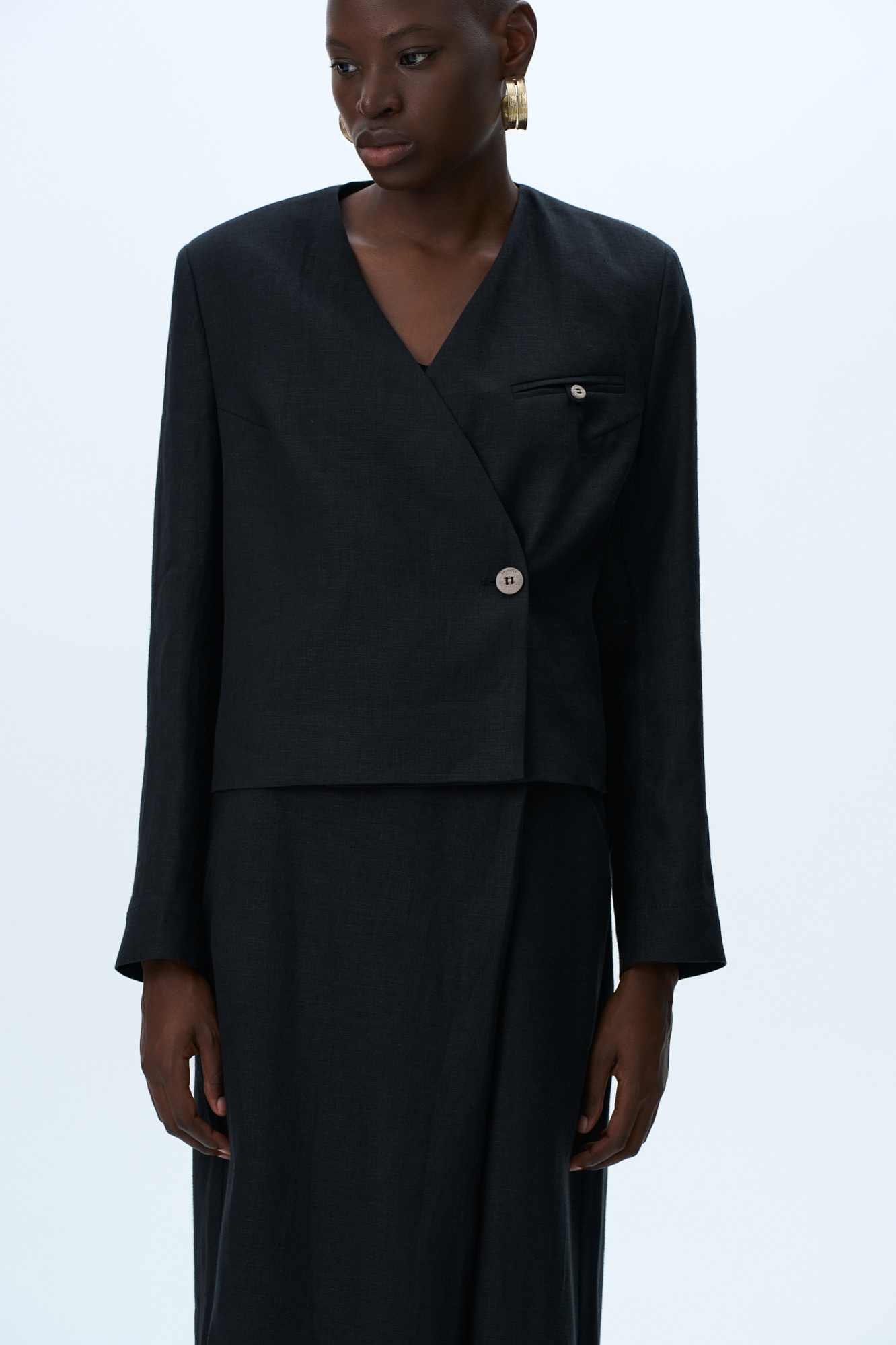 Укороченный жакет на запах из 100% льна. Модель приталенного силуэта с карманом на груди. Застежка на пуговицу. Дополнить образ можно брюками в таком же стиле.