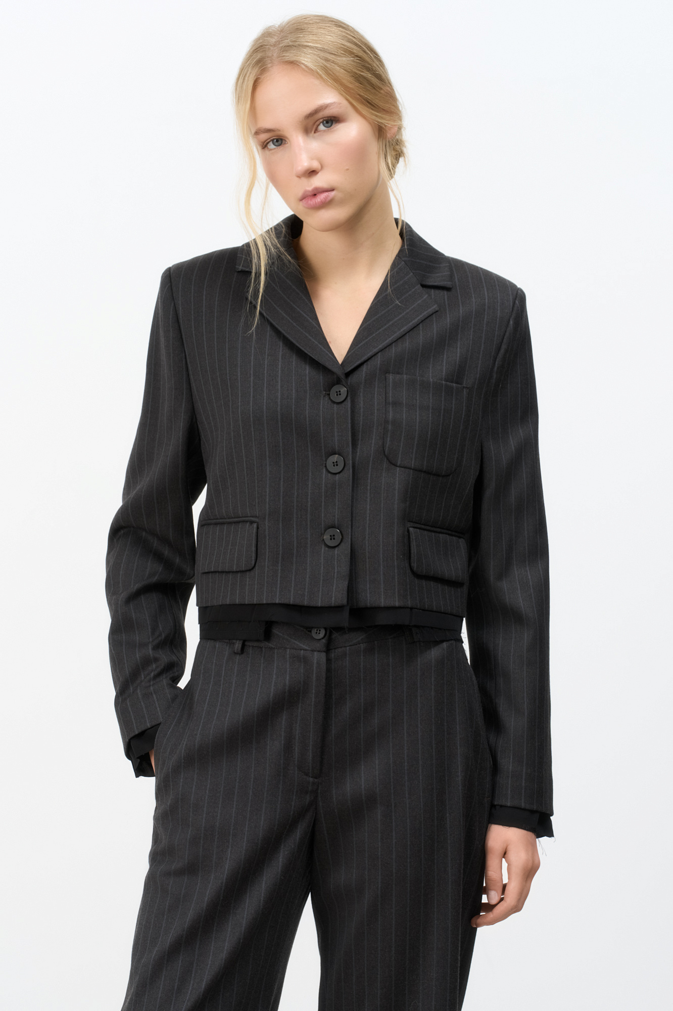 Укороченный жакет из шерсти. Модель с отложным воротником, нагрудным карманом и застежкой на пуговицы. Дополнить образ можно юбкой или брюками в таком же стиле. Изделие на подкладке.