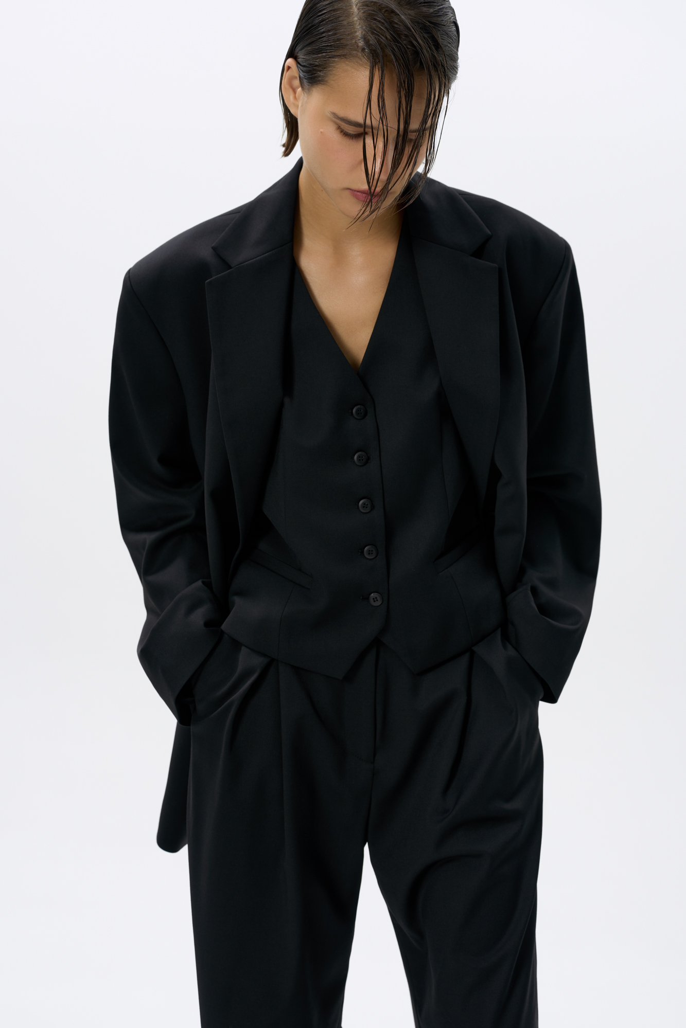 Классический однобортный жакет. Модель свободного силуэта с отложным воротником, широкими рукавами и накладными карманами с клапанами. Застежка на пуговицы. Изделие выполнено на подкладке.