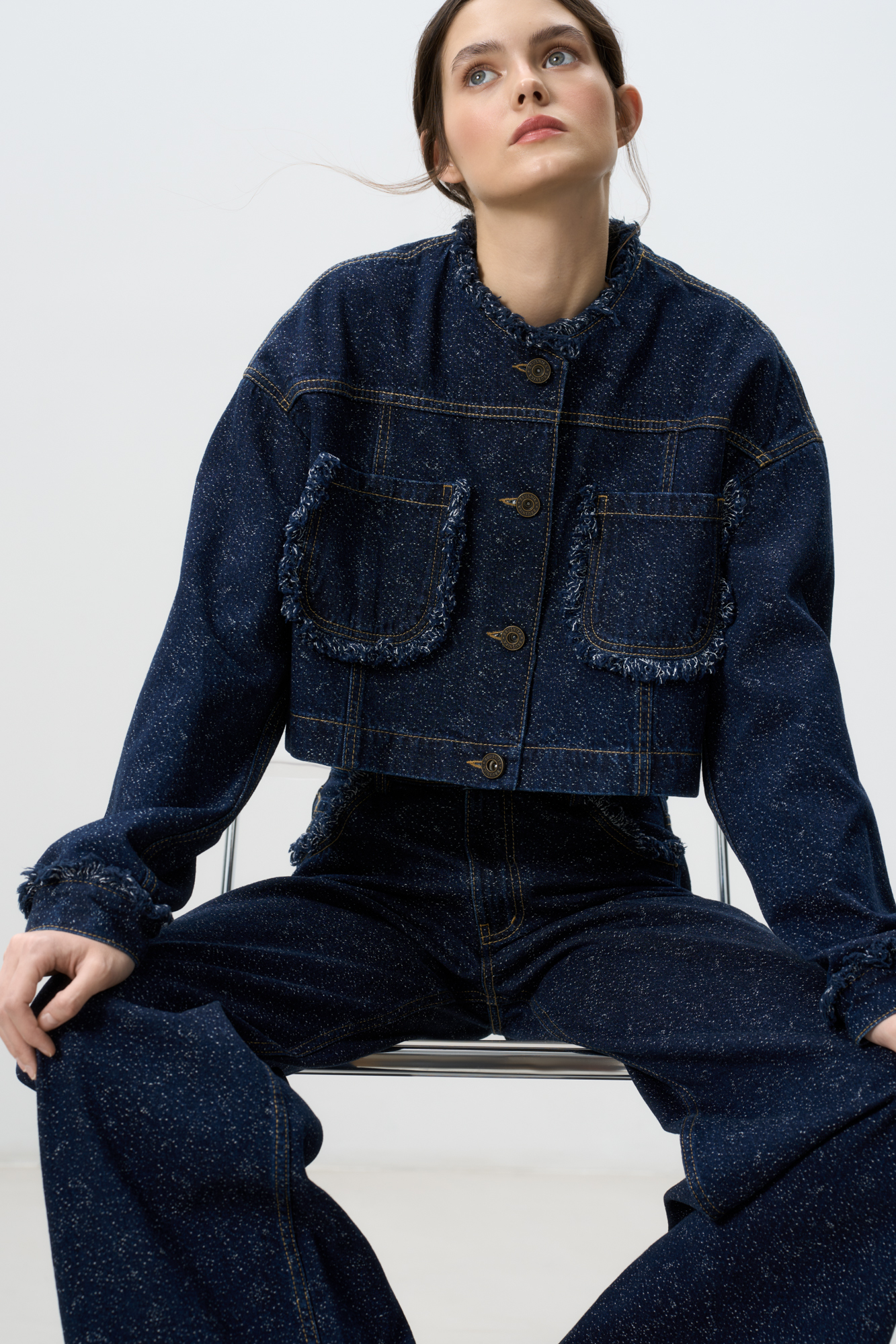 Джинсовый жакет из 100% хлопка. Модель свободного силуэта со спущенной линией плеча и накладными карманами. Застежка на металлические пуговицы. Изделие декорировано бахромой на карманах, манжетах рукавов и воротнике. Дополнить образ можно юбкой в таком же стиле.