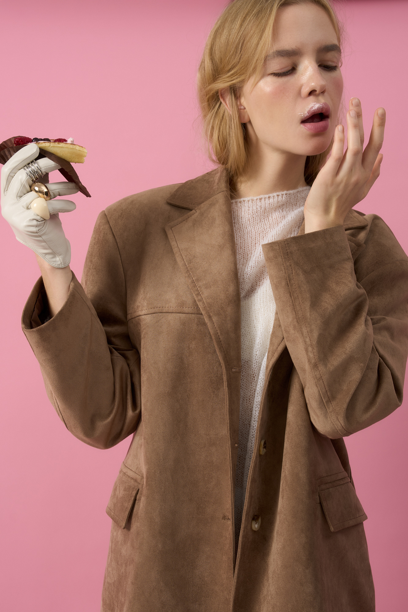Однобортный жакет из ткани с имитацией внешнего вида и свойств натуральной замши. Модель с классическим отложным воротником и боковыми карманами с клапанами. Отделка строчкой в тон. Застежка на три пуговицы. Изделие на подкладке.