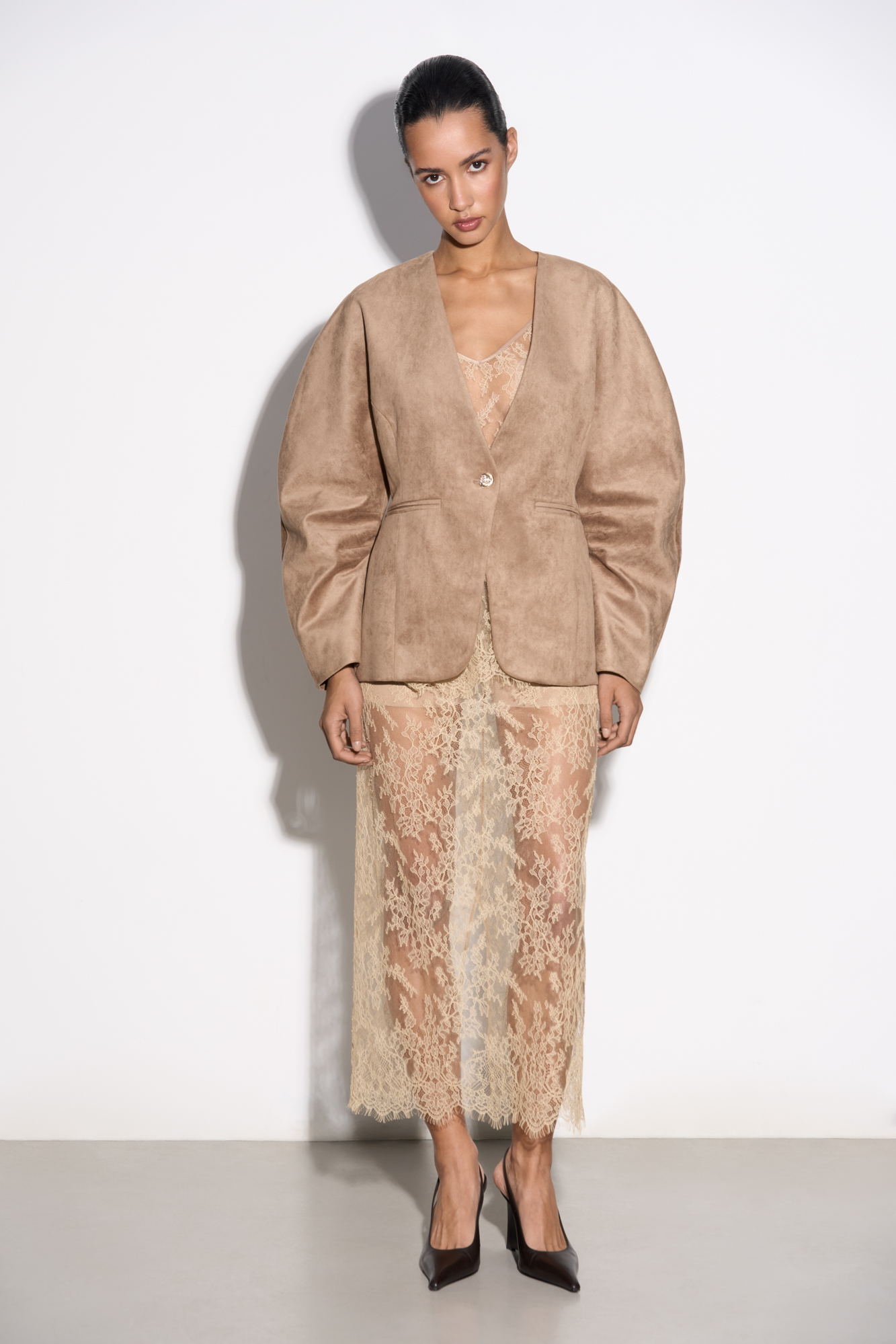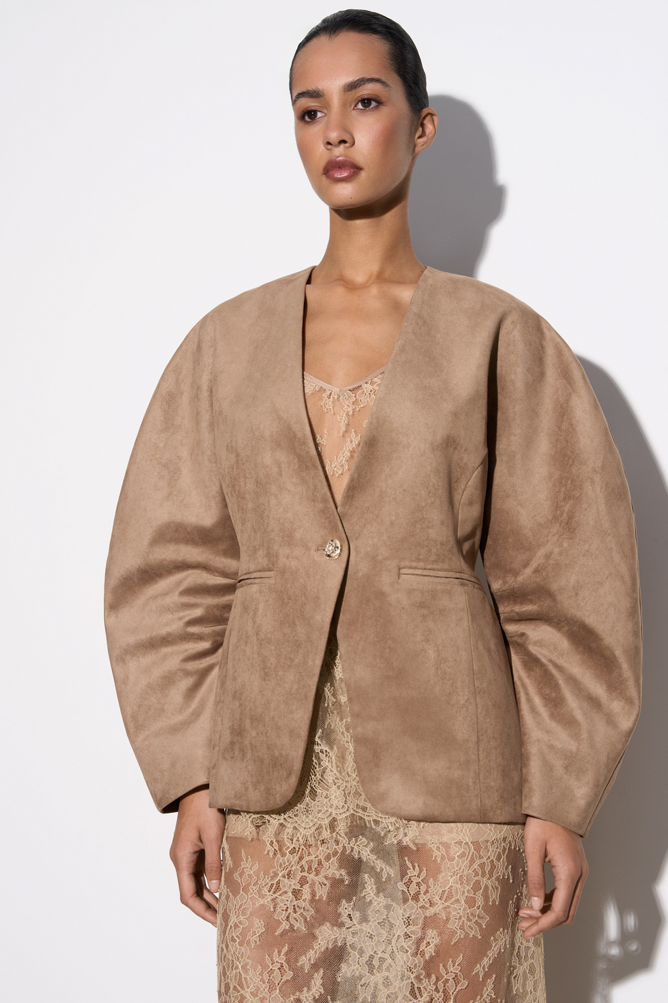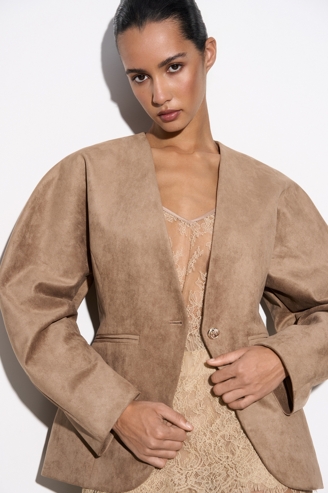 Однобортный жакет из ткани с имитацией внешнего вида и свойств натуральной замши. Модель без лацканов с большими объемными рукавами и боковыми прорезными карманами. Изделие на подкладке.