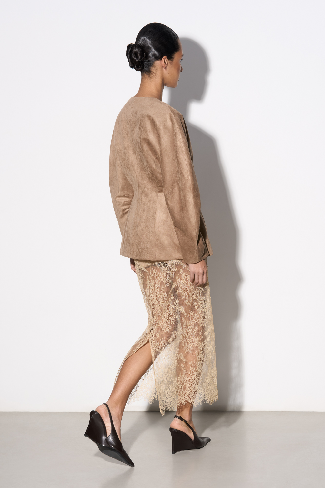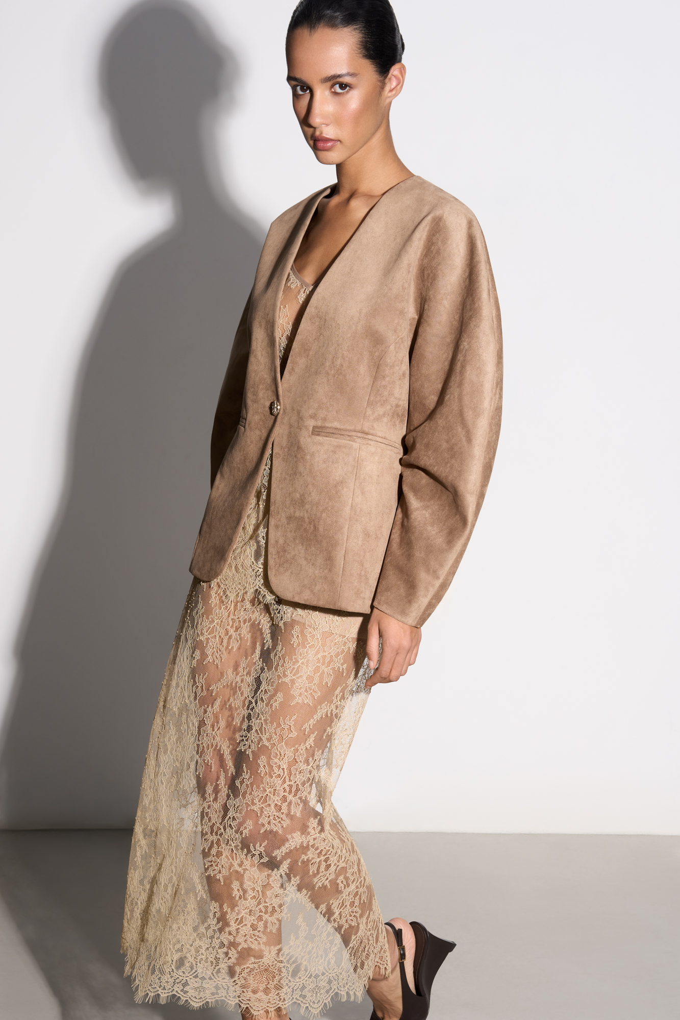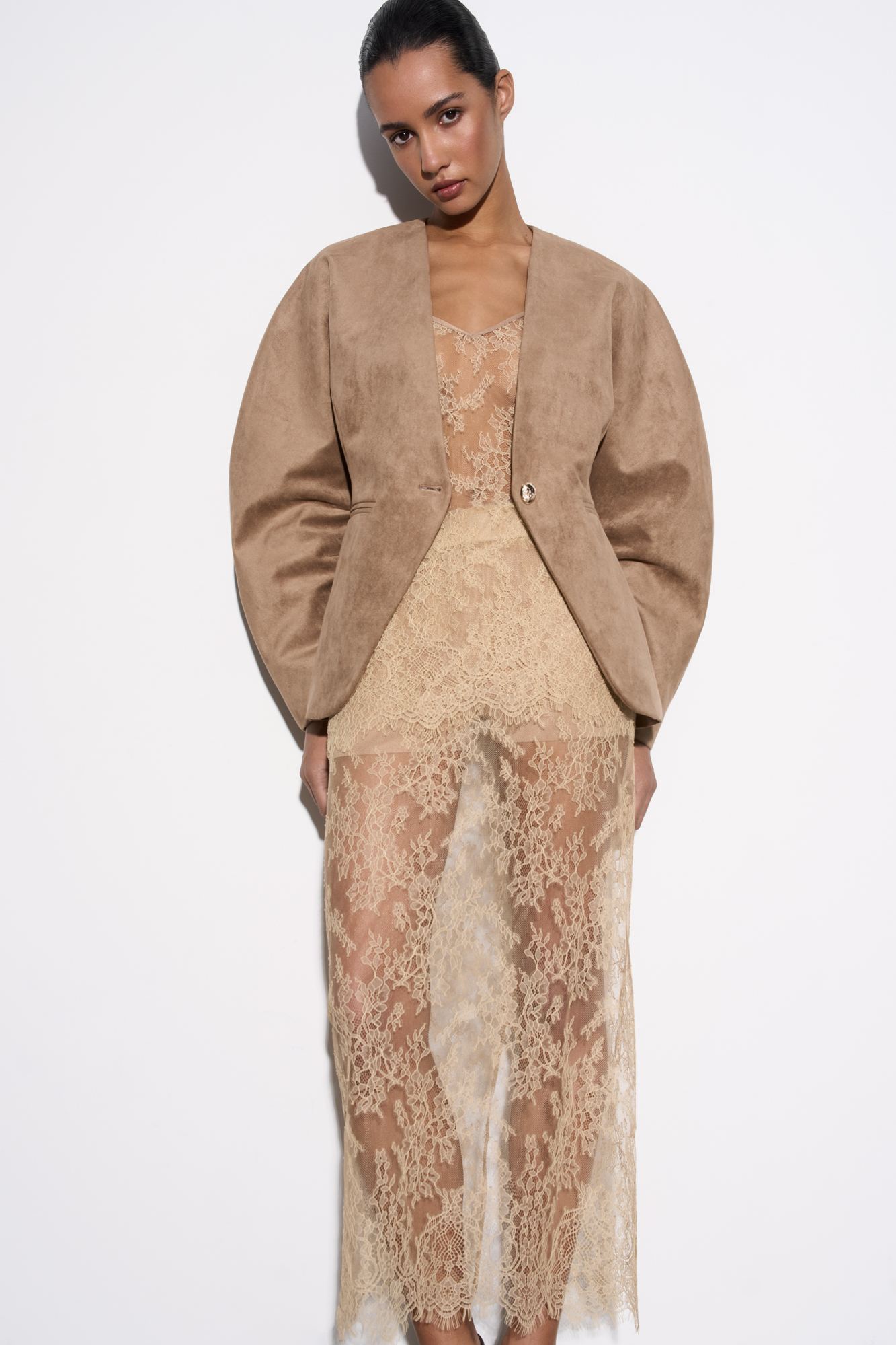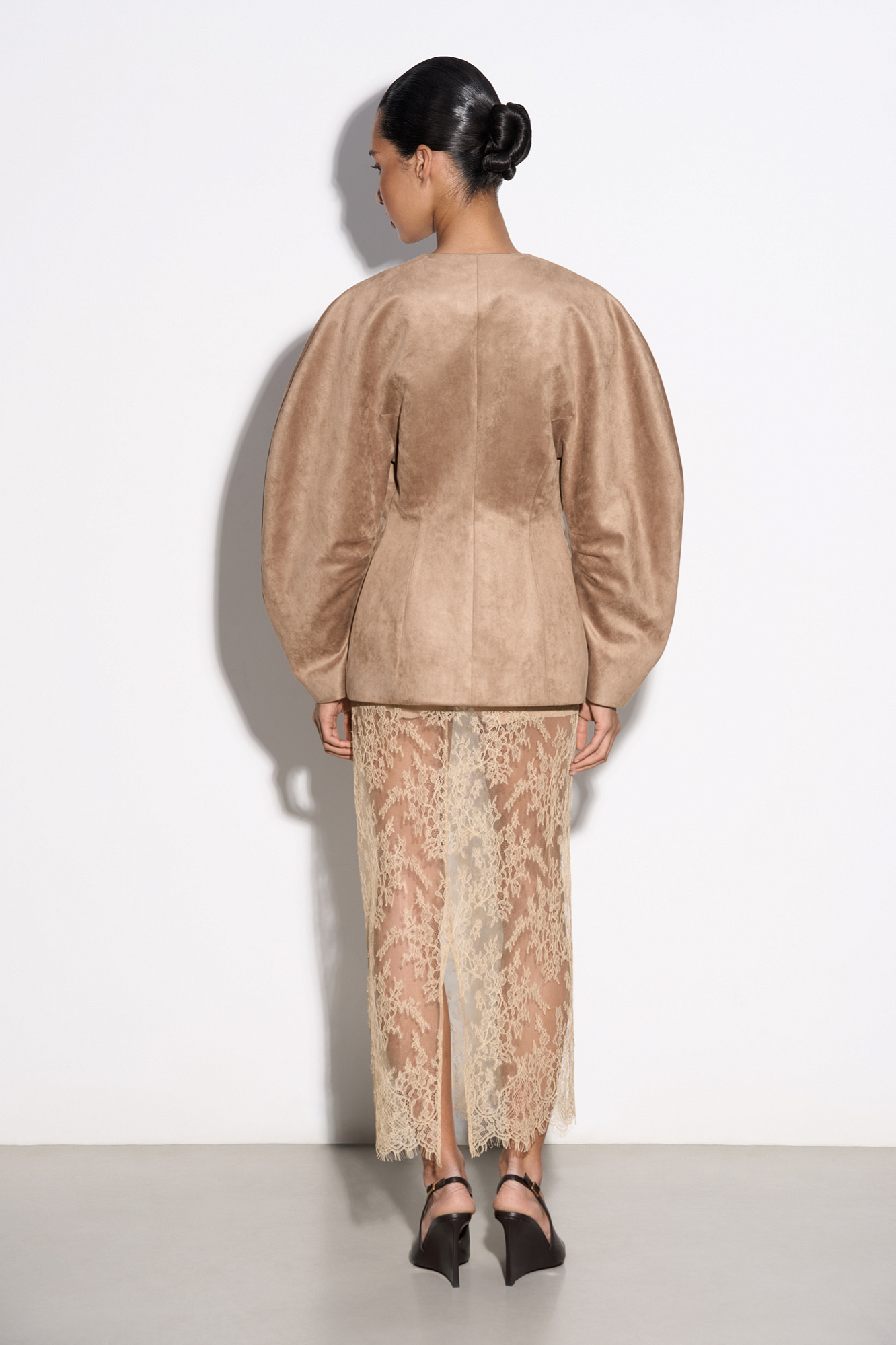 Однобортный жакет из ткани с имитацией внешнего вида и свойств натуральной замши. Модель без лацканов с большими объемными рукавами и боковыми прорезными карманами. Изделие на подкладке.