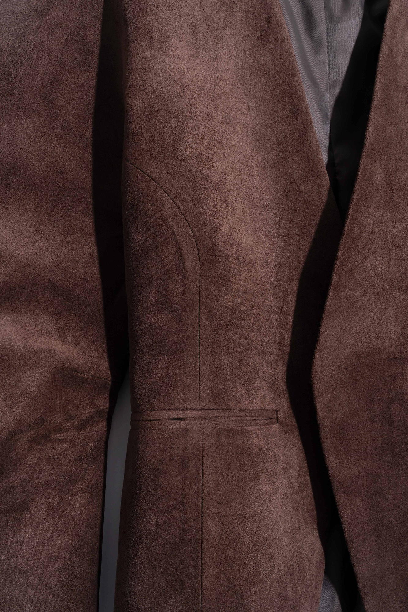 Однобортный жакет из ткани с имитацией внешнего вида и свойств натуральной замши. Модель без лацканов с большими объемными рукавами и боковыми прорезными карманами. Изделие на подкладке.