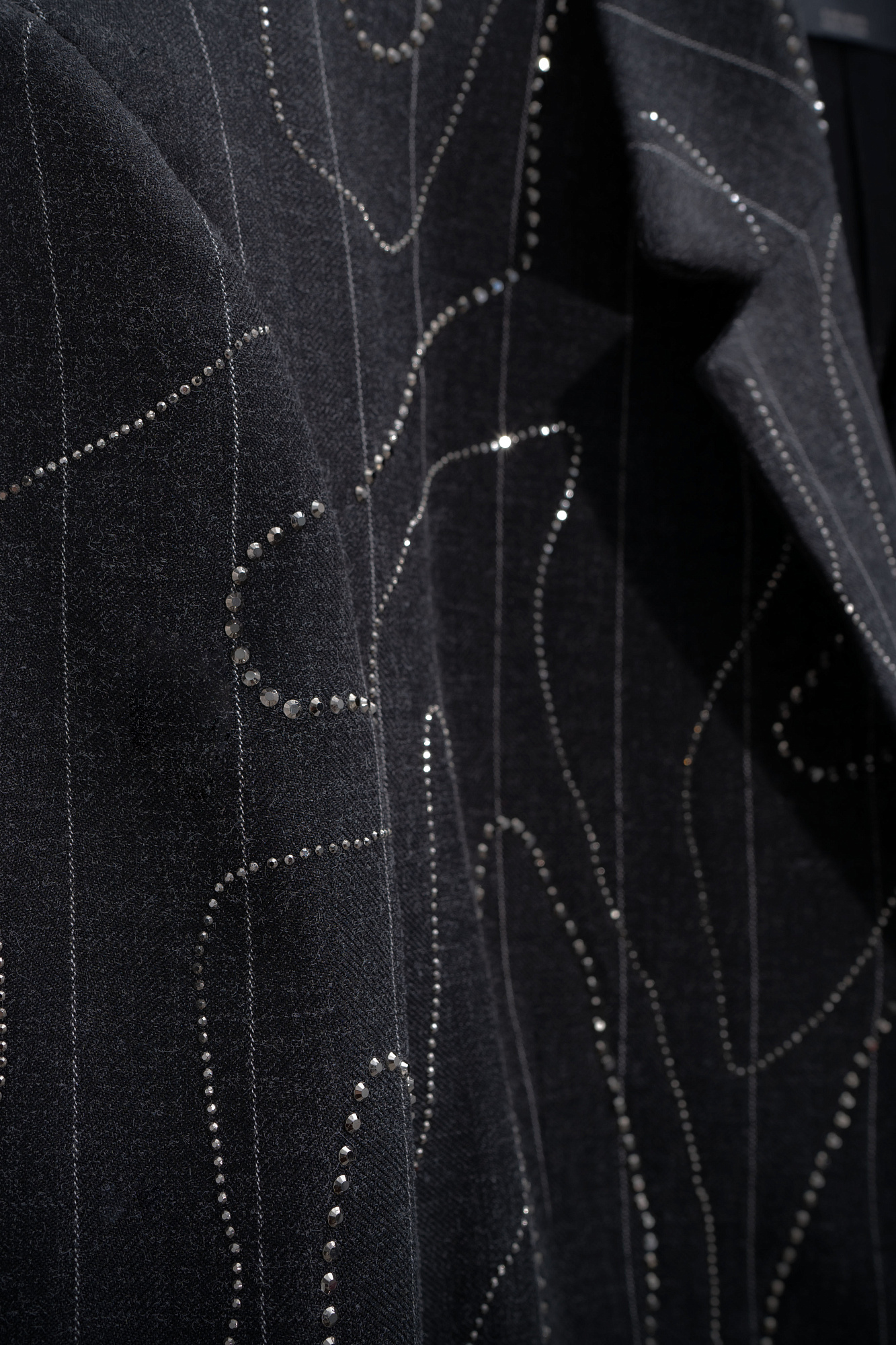 Однобортный жакет из шерсти, декорированный узором из страз. Модель прямого кроя с узкими лацканами, широкими плечами, боковыми карманами с клапанами и застежкой на две пуговицы. Изделие выполнено на подкладке.
