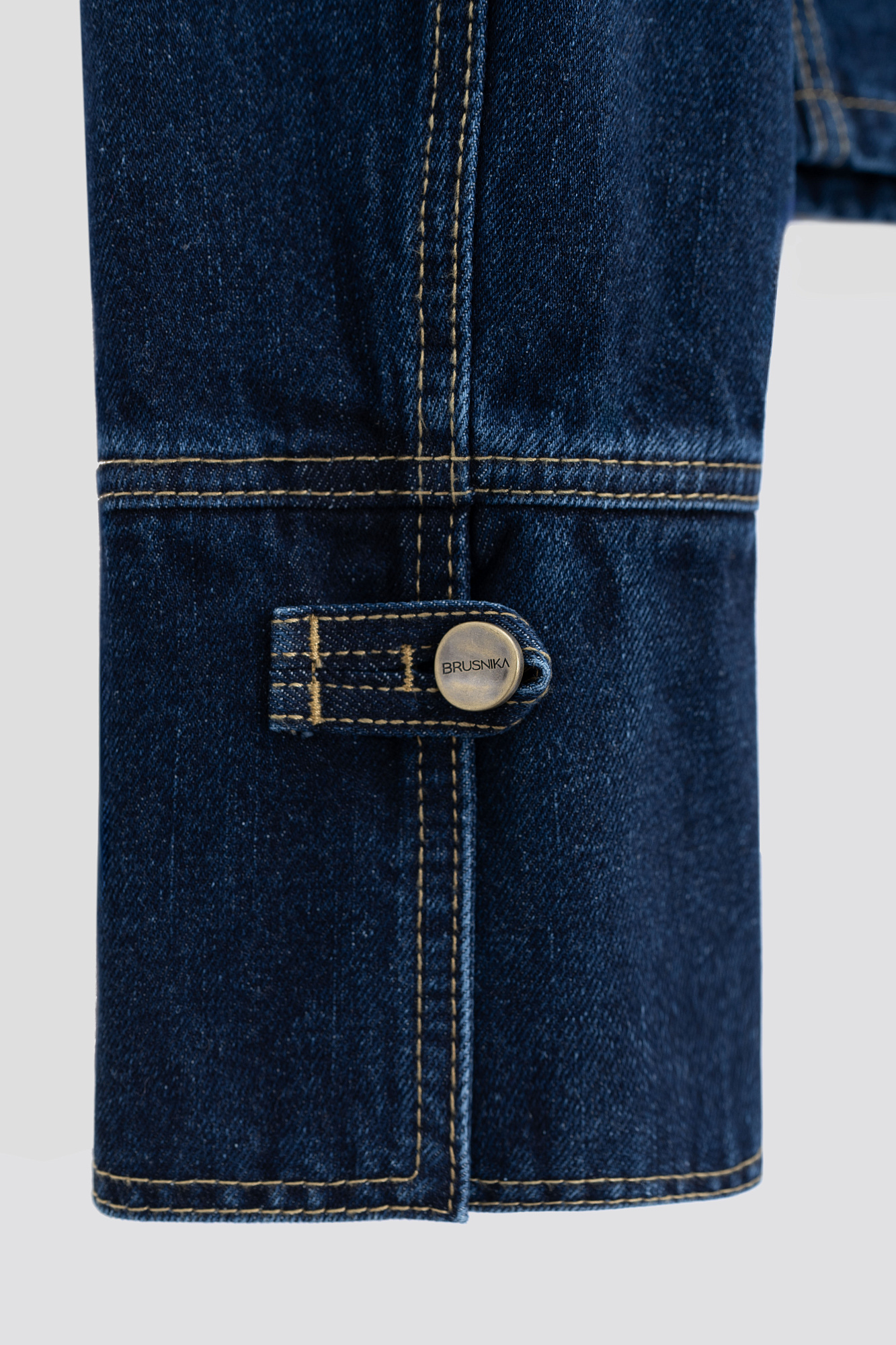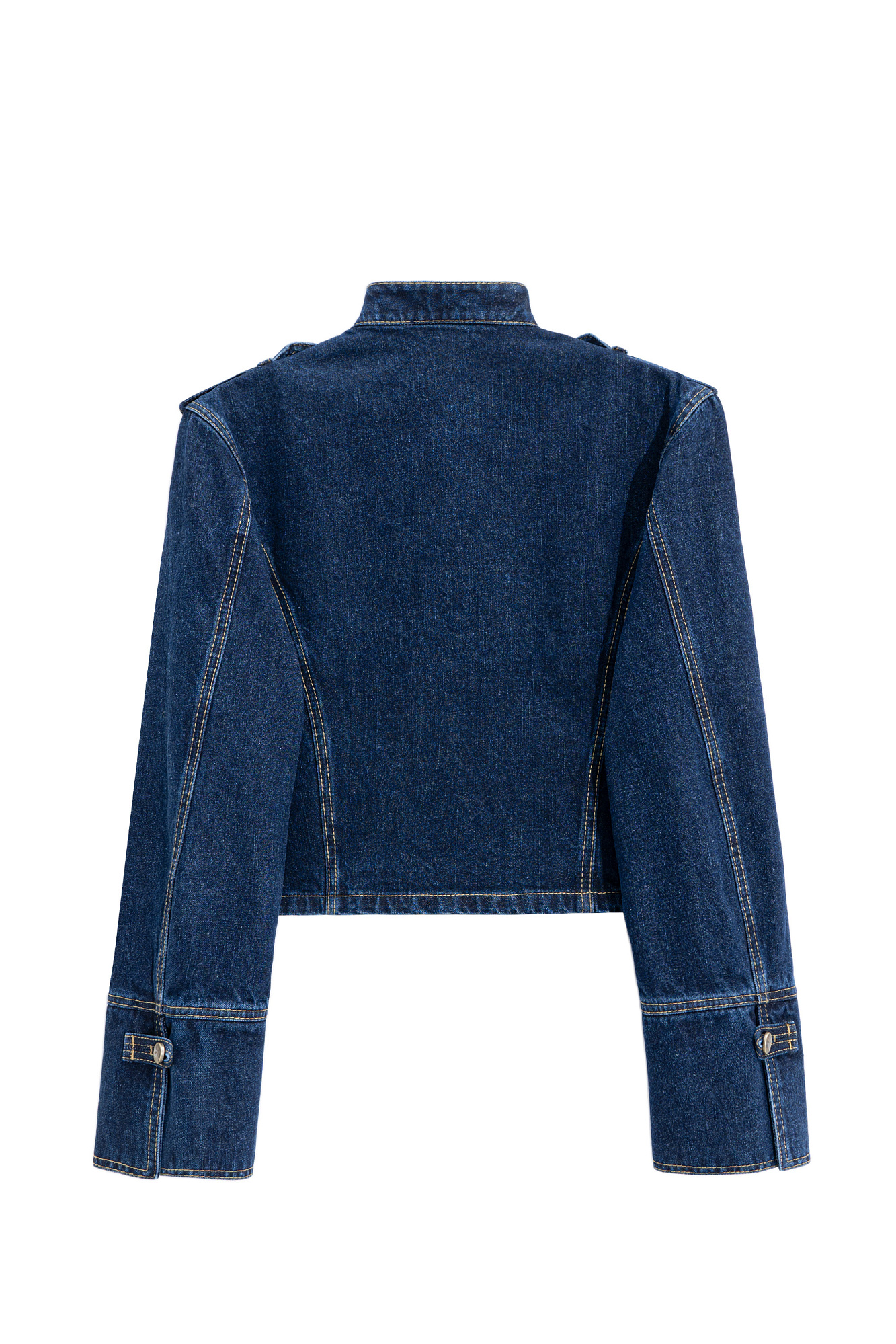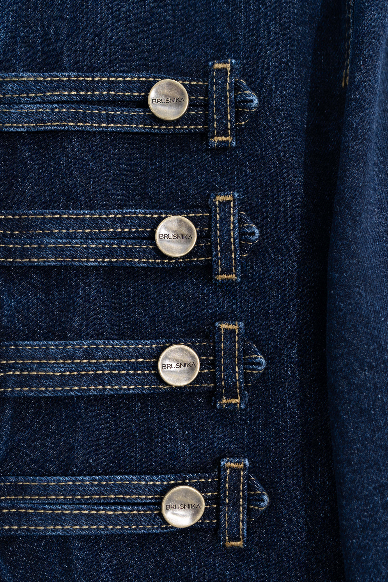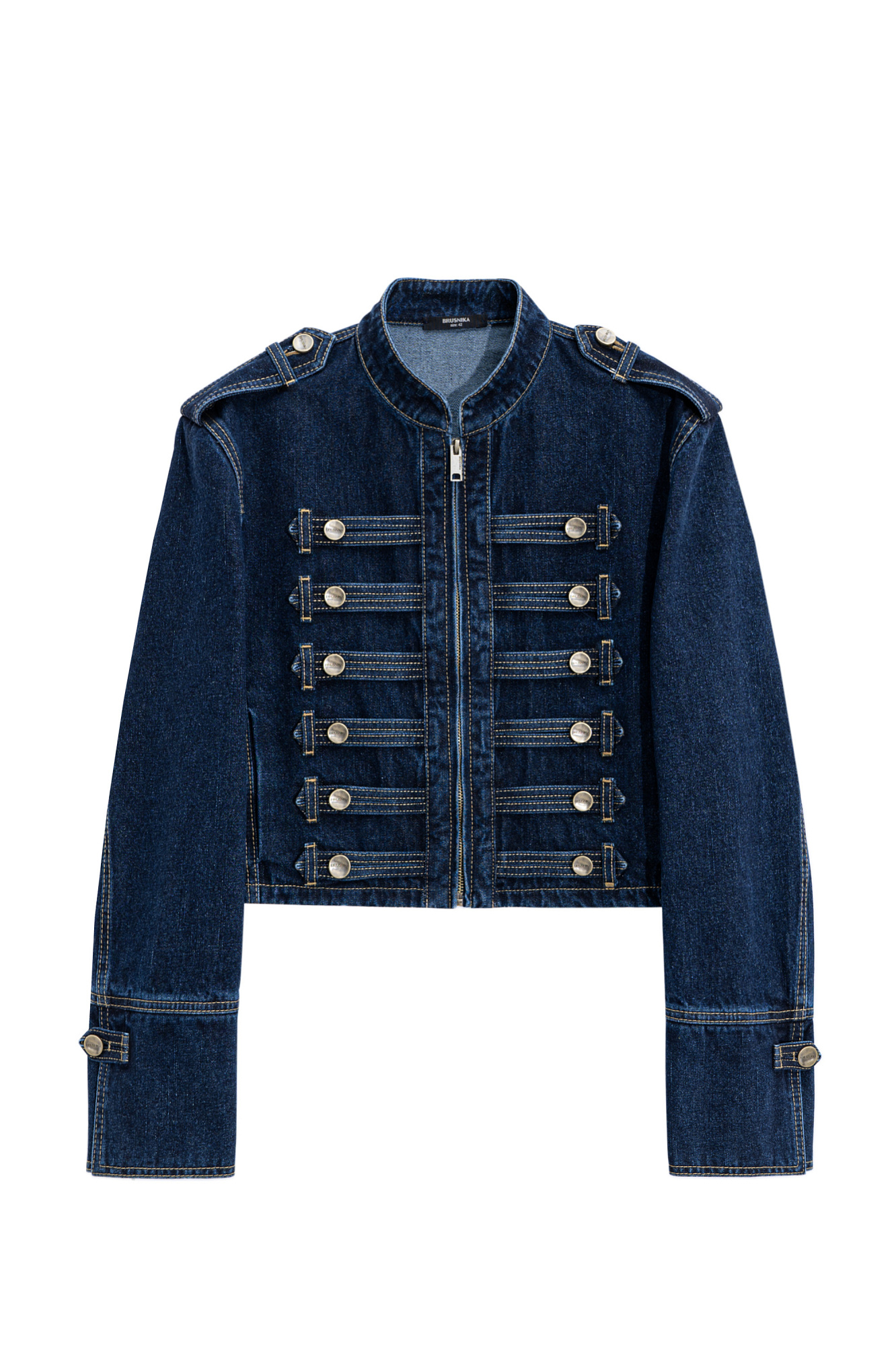 Джинсовый жакет-доломан в гусарском стиле, выполненный из 100% хлопка. Модель прямого силуэта с воротником стойкой, патами на плечах и манжетах рукавов. Изделие декорировано металлическими брендированными пуговицами и контрастной отстрочкой. Застежка на молнию.