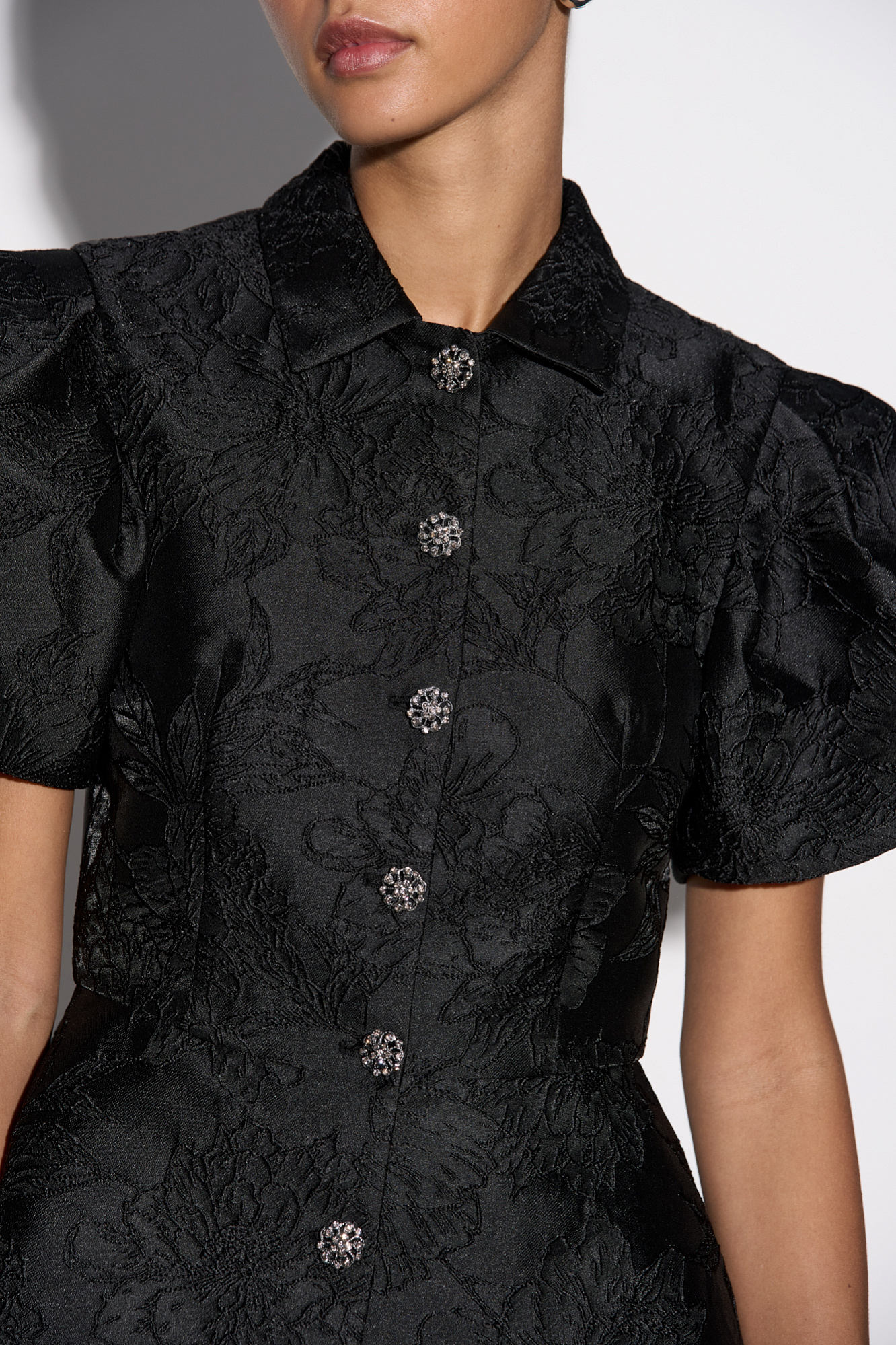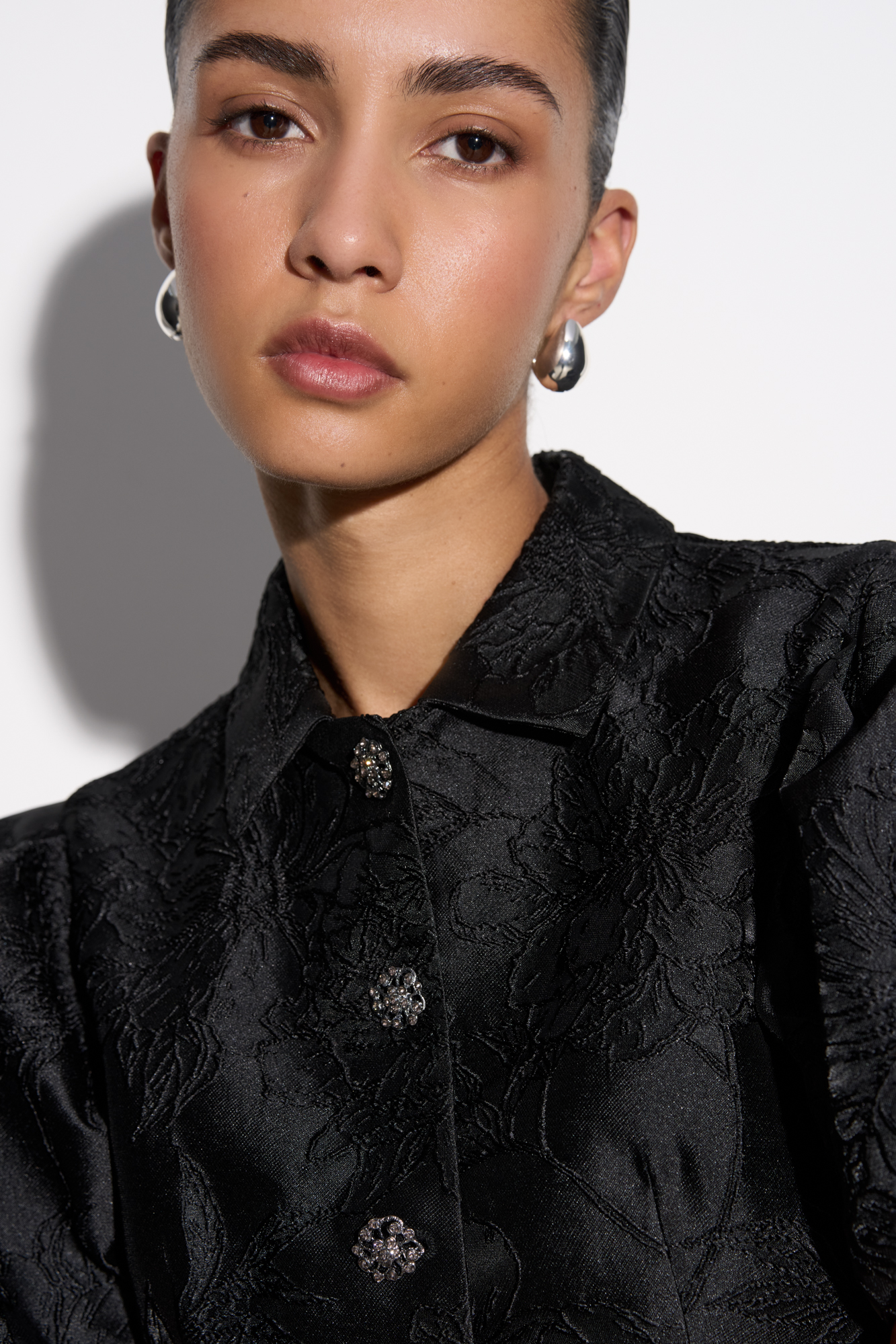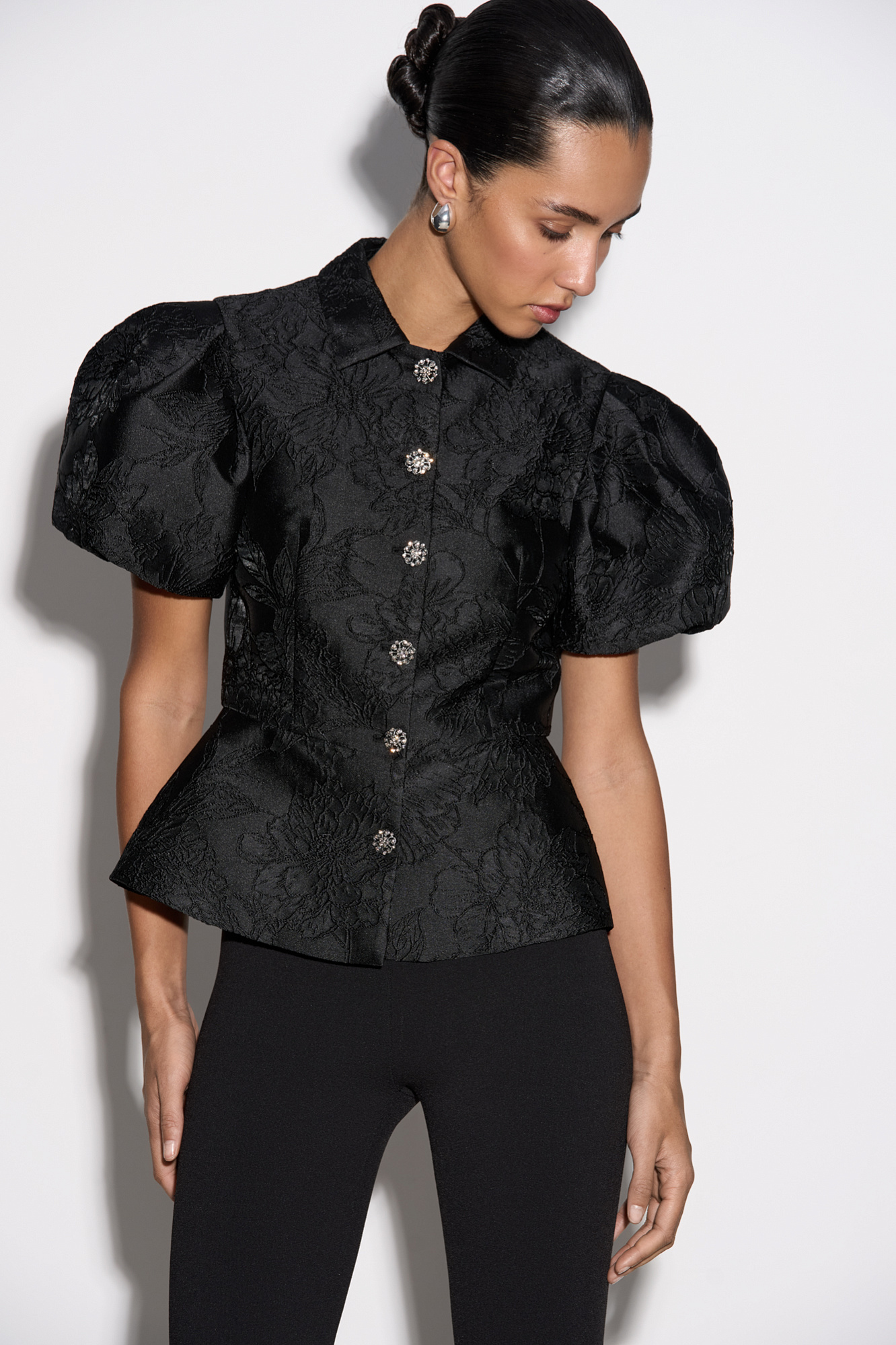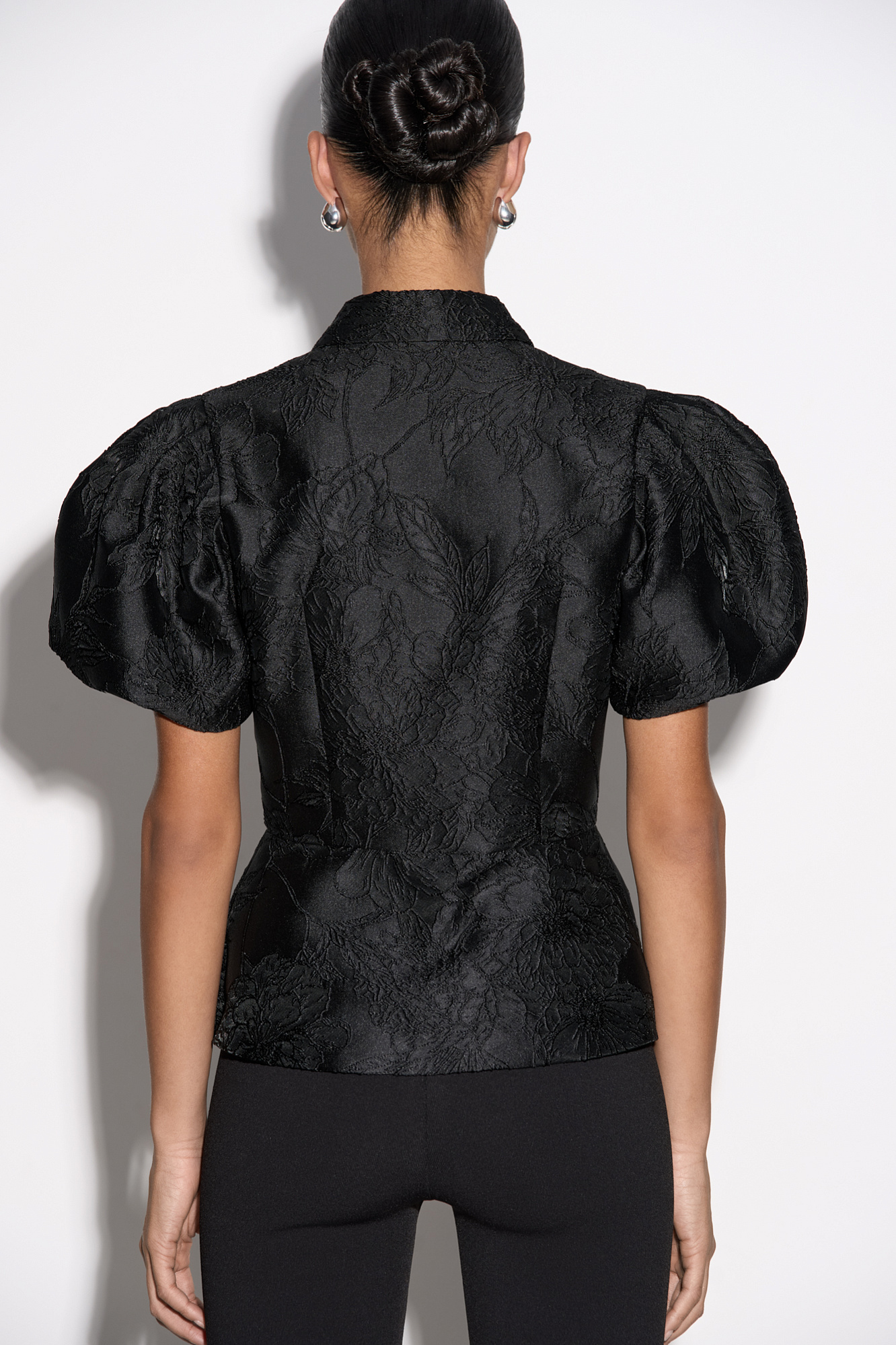 Однобортный жакет из жаккарда с баской. Модель приталенного силуэта с рукавами-фонариками и отложным воротником. Застежка на акцентные пуговицы. Изделие выполнено на подкладке.