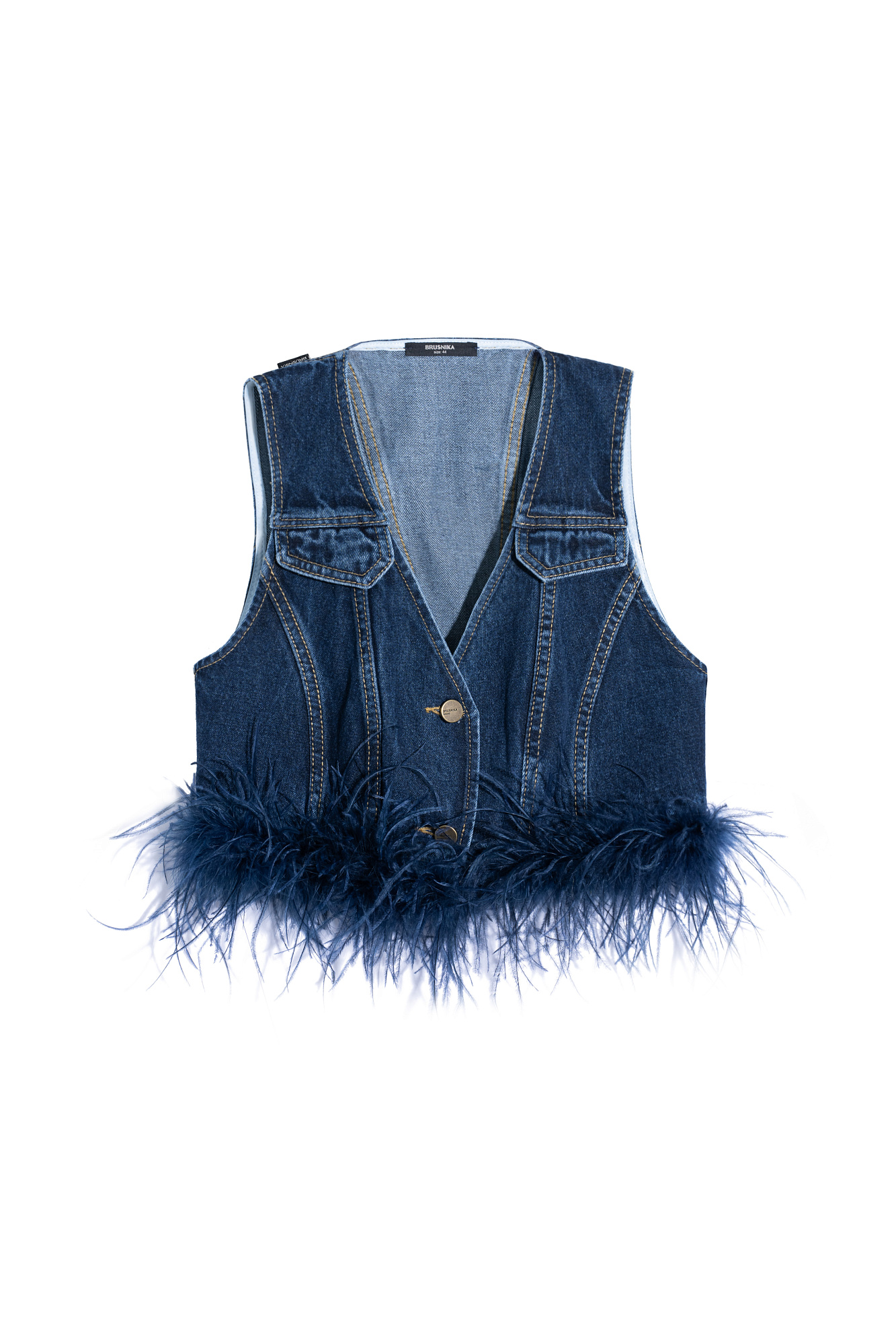Джинсовый жилет из 100% хлопка, декорированный лентой со страусиными перьями. Лента с перьями отстегивается. Застежка изделия на металлические пуговицы.