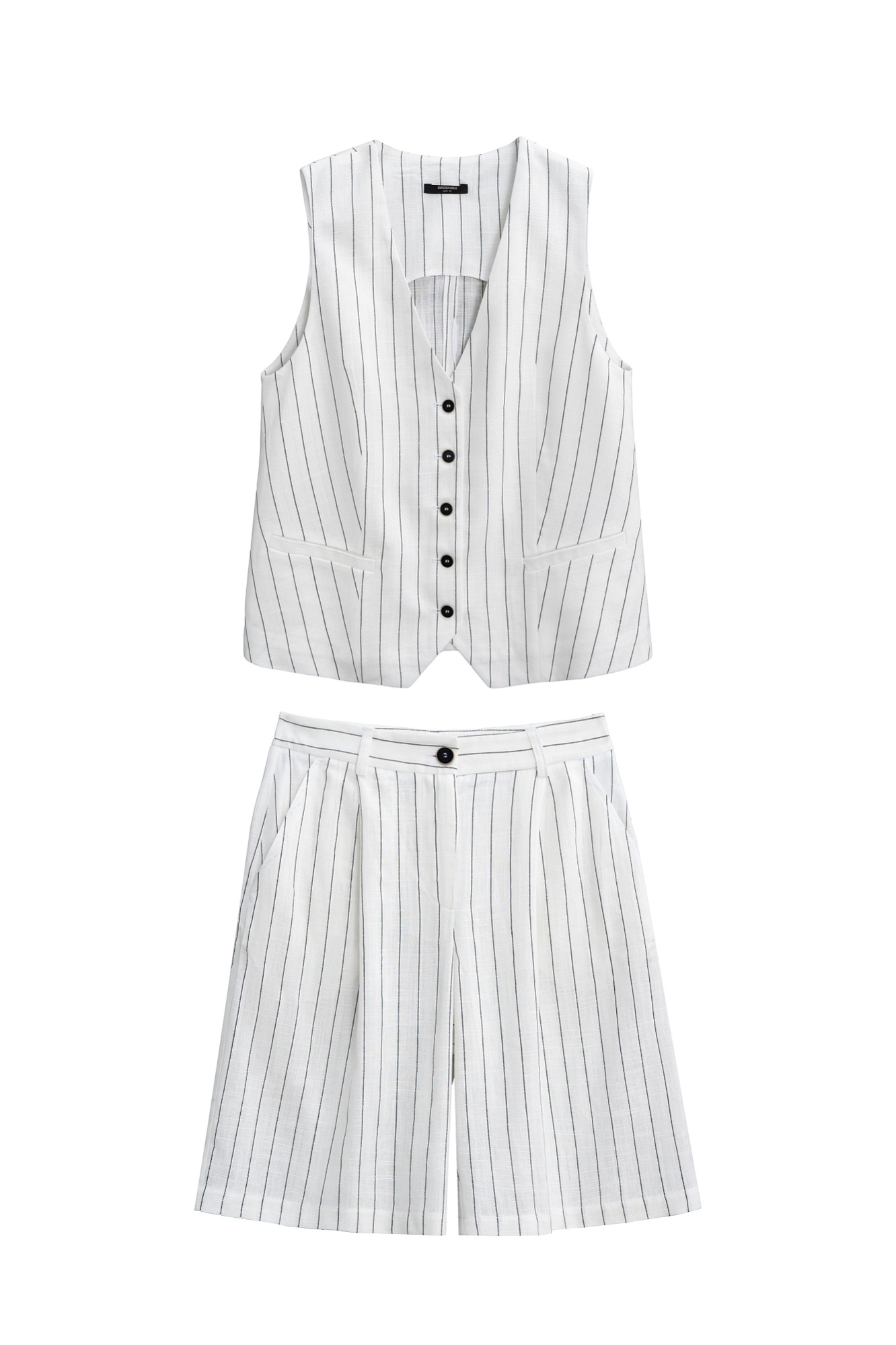 Льняной костюм в полоску из жилета и шорт. Классический жилет прямого кроя, с V-образным вырезом и застежкой на пуговицы. Короткие шорты с боковыми карманами и шлевками на поясе для ремня.Застежка на молнию и пуговицу.