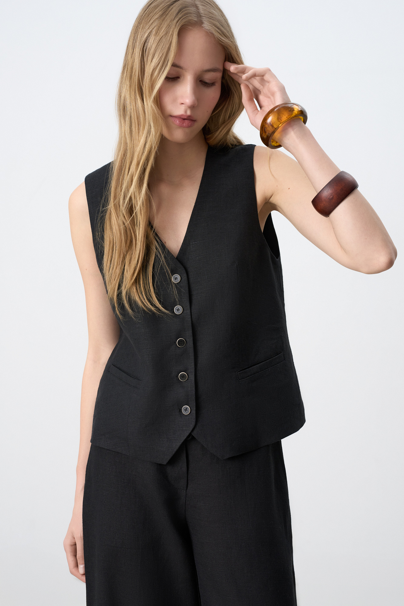 Классический жилет из 100% льна. Модель прямого кроя, с V-образным вырезом, карманами и застежкой на пуговицы.