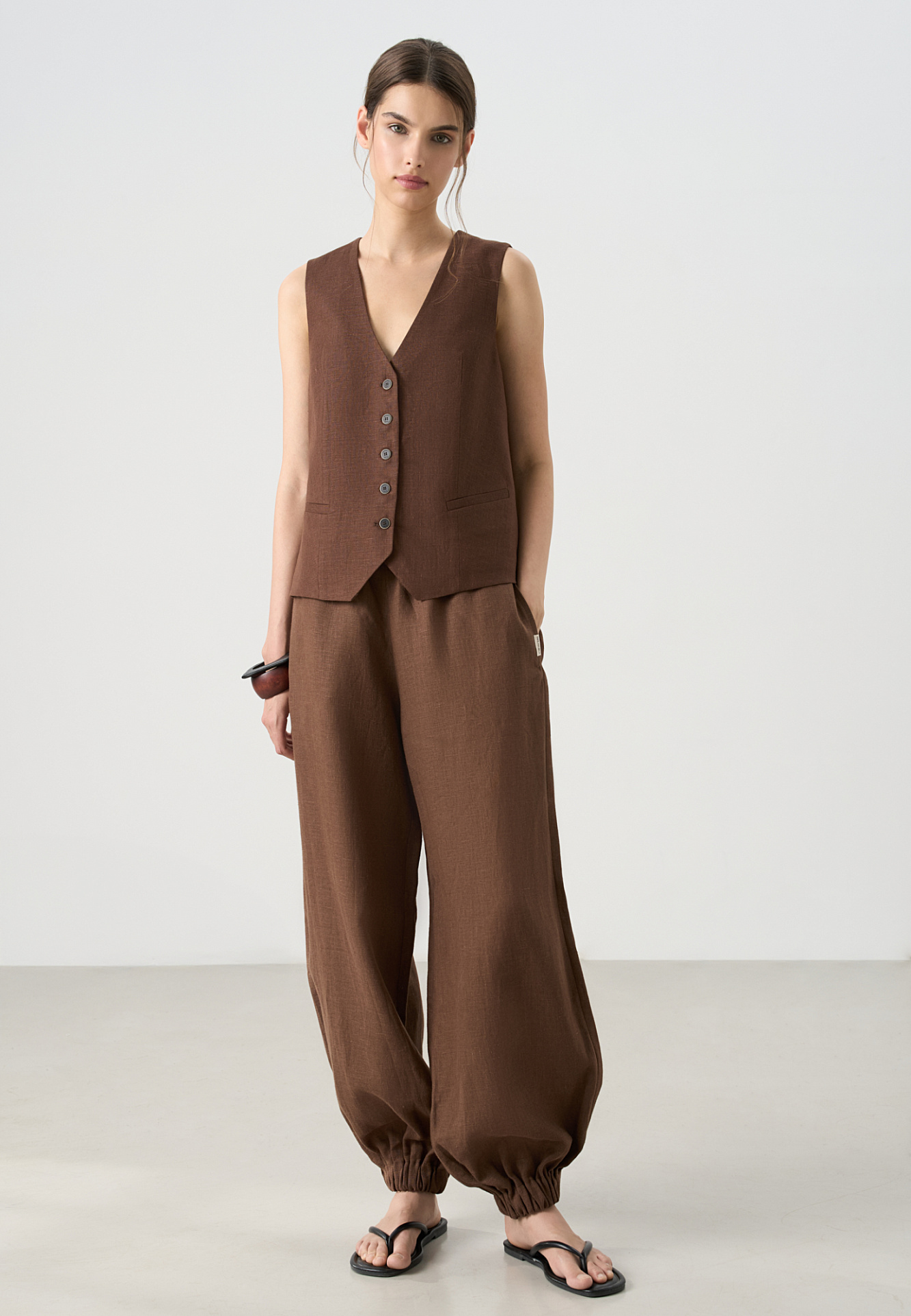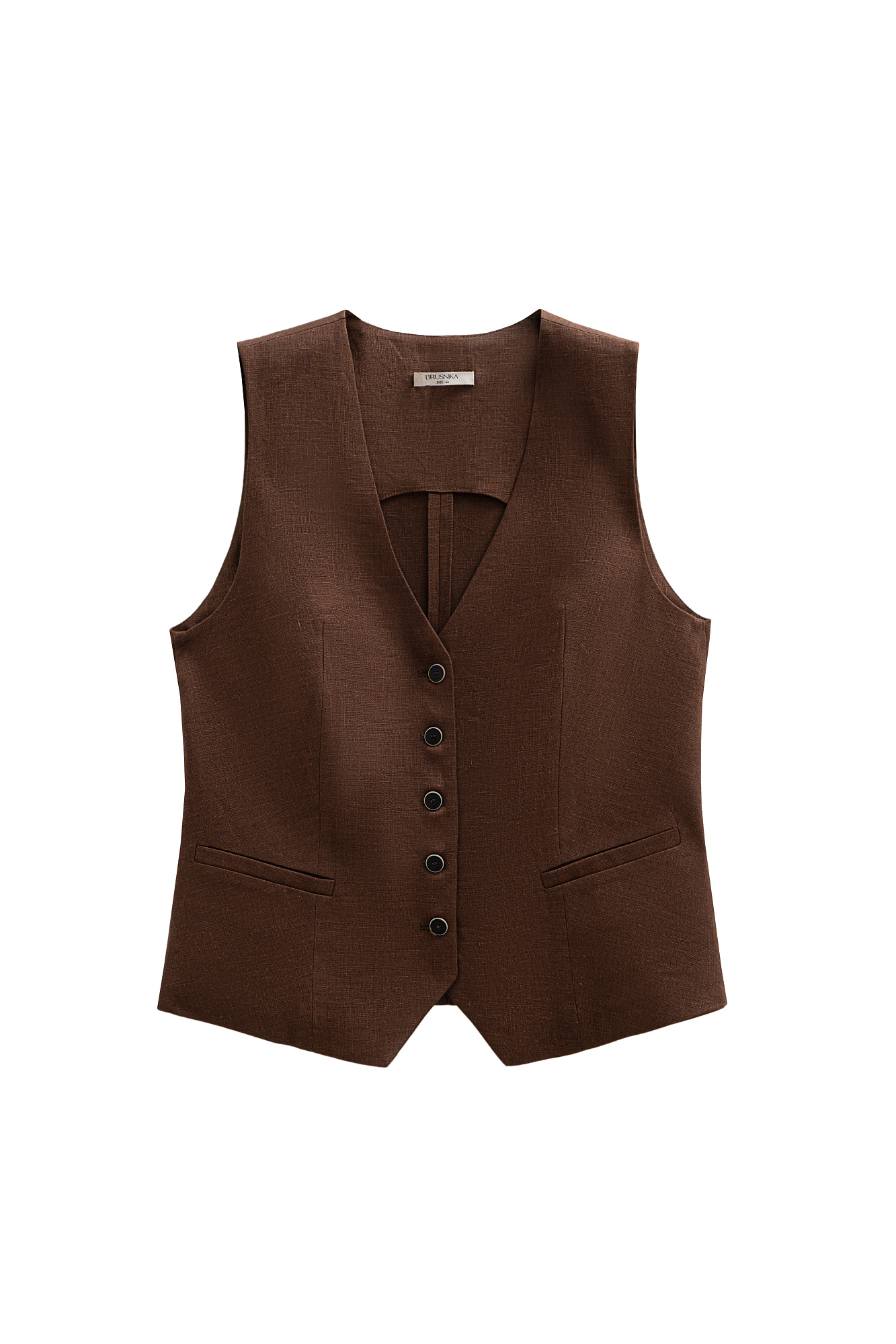 Классический жилет из 100% льна. Модель прямого кроя, с V-образным вырезом, карманами и застежкой на пуговицы.