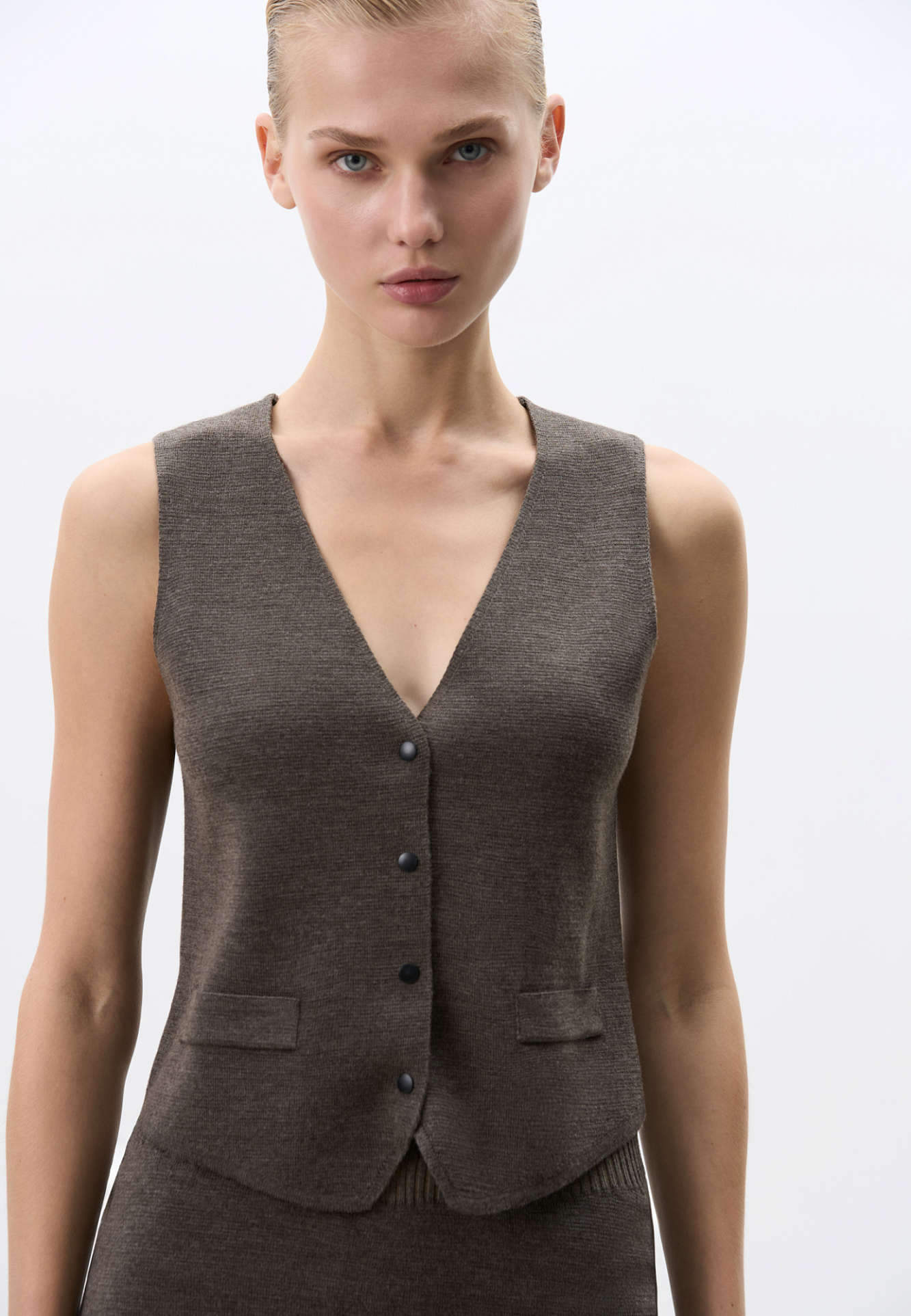 Трикотажный однобортный жилет из шерсти мериноса экстрафайн. Модель прямого кроя с имитацией карманов с клапанами и V-образным вырезом. Застежка на кнопки. Изделие без подкладки. Дополнить образ можно жакетом, бомбером, брюками или юбкой.