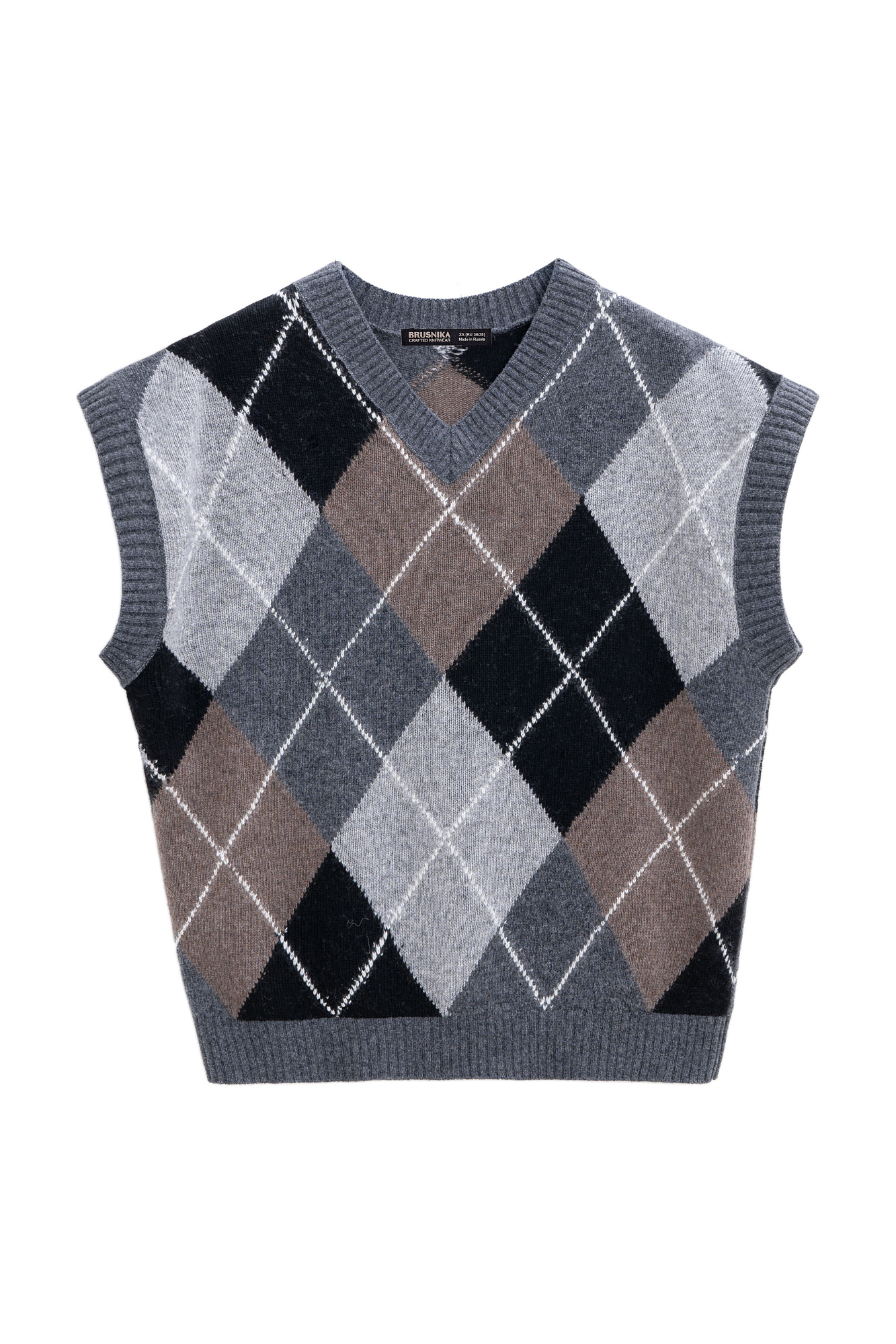 Трикотажный жилет из кашемира с узором аргайл. Модель свободного силуэта без рукавов с неглубоким V-образным вырезом горловины. Края изделия выполнены в рубчик.