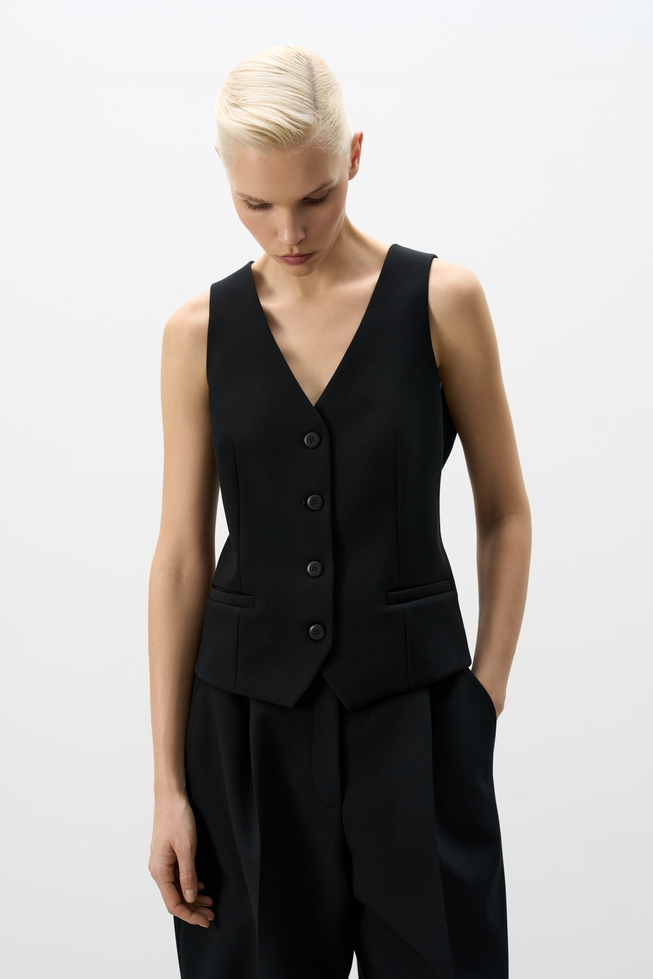 Классический жилет из поливискозы. Модель приталенного силуэта с имитацией карманов и v-образным вырезом. Застежка на пуговицы.