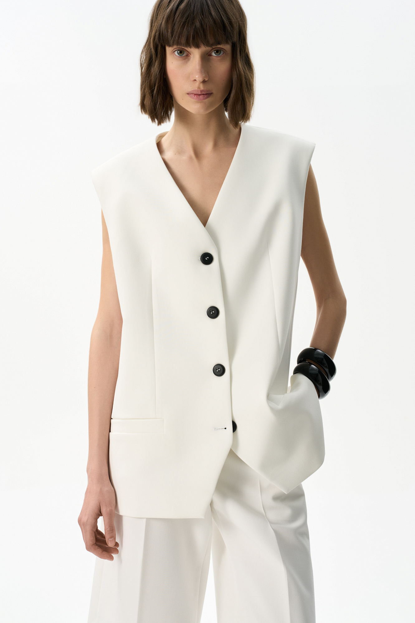 Классический жилет из поливискозы. Модель прямого кроя с имитацией карманов и V-образным вырезом. Изделие на подкладке. Застежка на пуговицы.