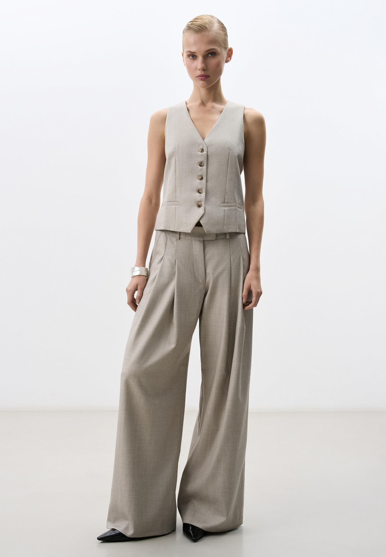 Классический жилет из смесовой шерсти. Модель прямого кроя с имитацией карманов и V-образным вырезом. Застежка на пять пуговиц. Изделие без подкладки.