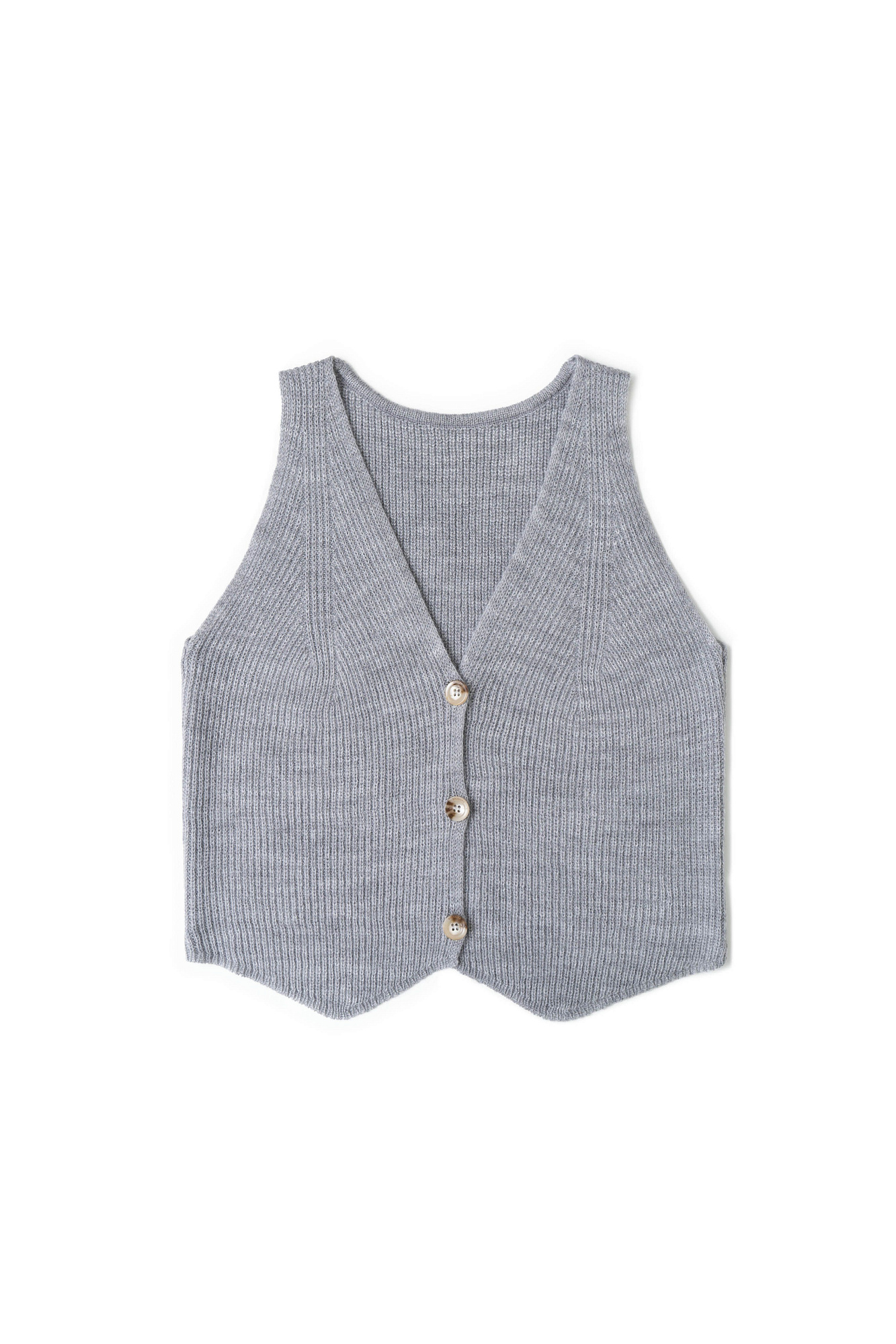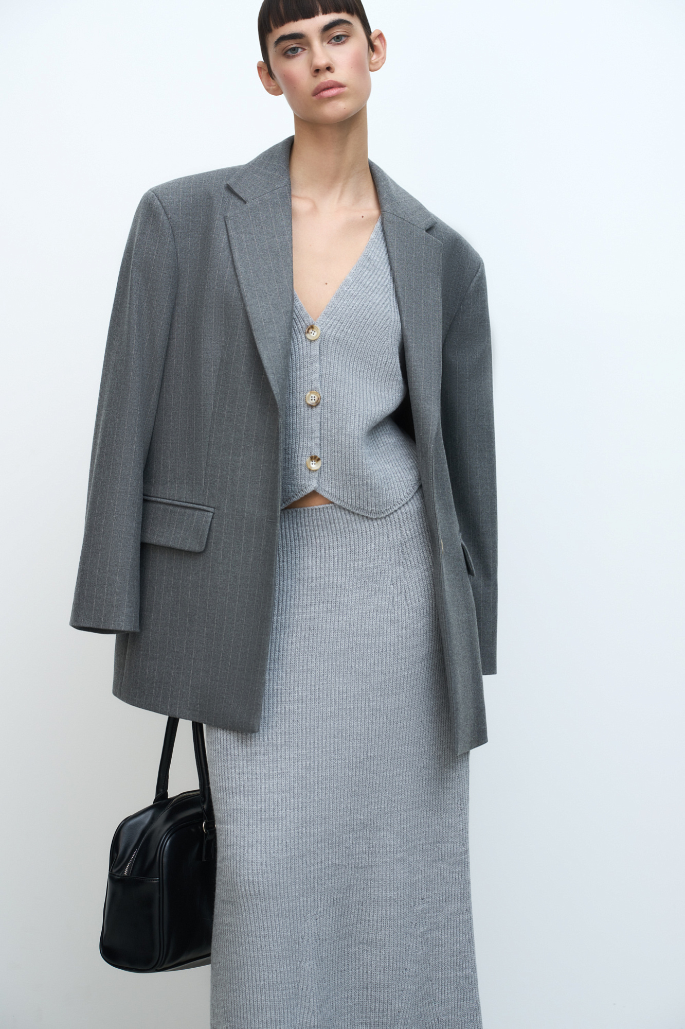 Трикотажный жилет из шерсти. Модель прямого кроя с глубоким V-образным вырезом и застежкой на пуговицы. Дополнить образ можно юбкой в таком же стиле.