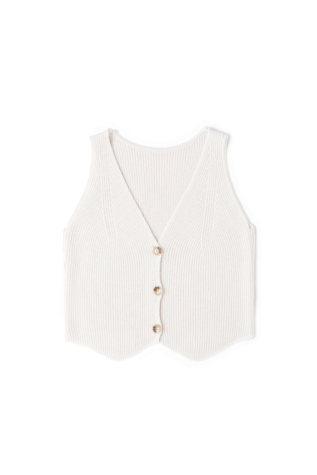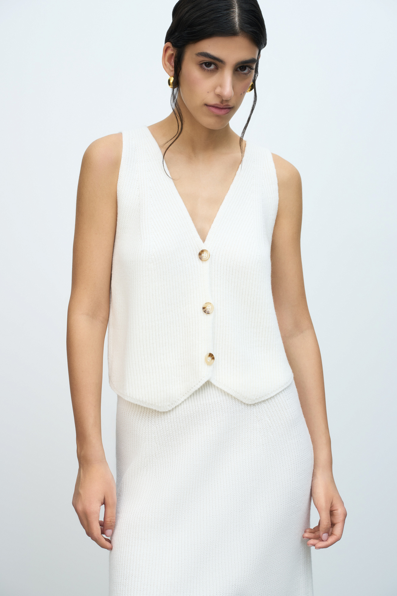 Трикотажный жилет из шерсти. Модель прямого кроя с глубоким V-образным вырезом и застежкой на пуговицы. Дополнить образ можно юбкой в таком же стиле.