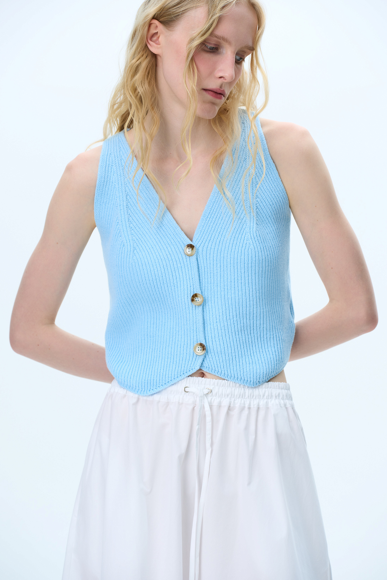 Трикотажный жилет из хлопка. Модель прямого кроя с V-образным вырезом и застежкой на пуговицы. Дополнить образ можно юбкой в таком же стиле.