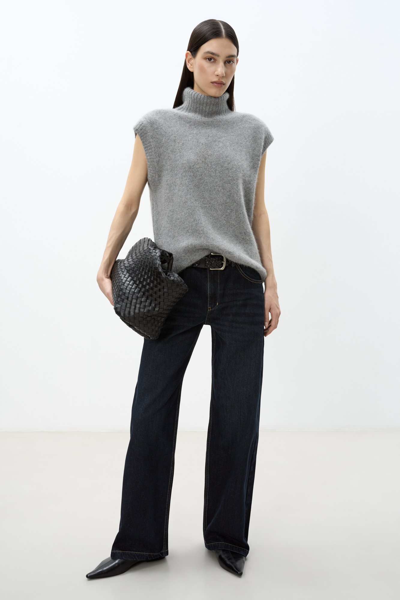 Трикотажный жилет с высоким воротом. Содержание в пряже 40% натурального пуха лисы делает жилет теплым и в тоже время очень легким. Дополнить образ можно юбкой в таком же стиле.