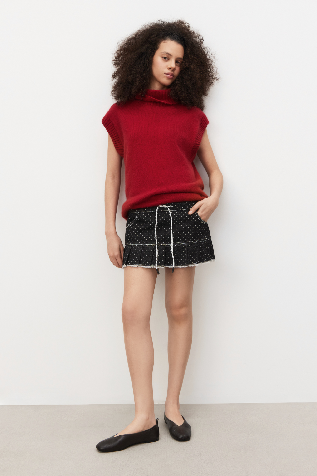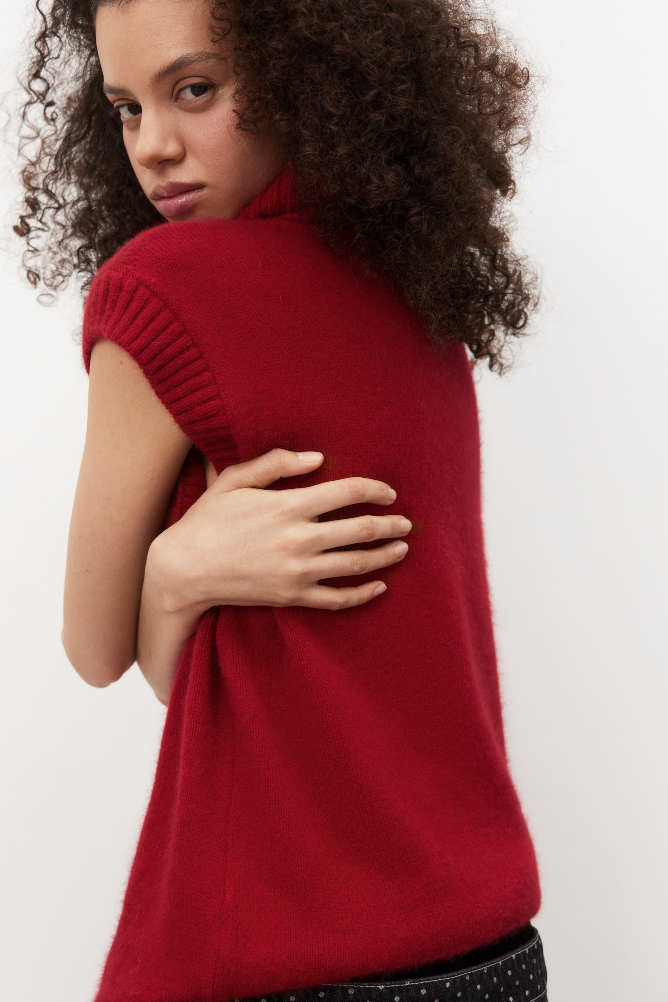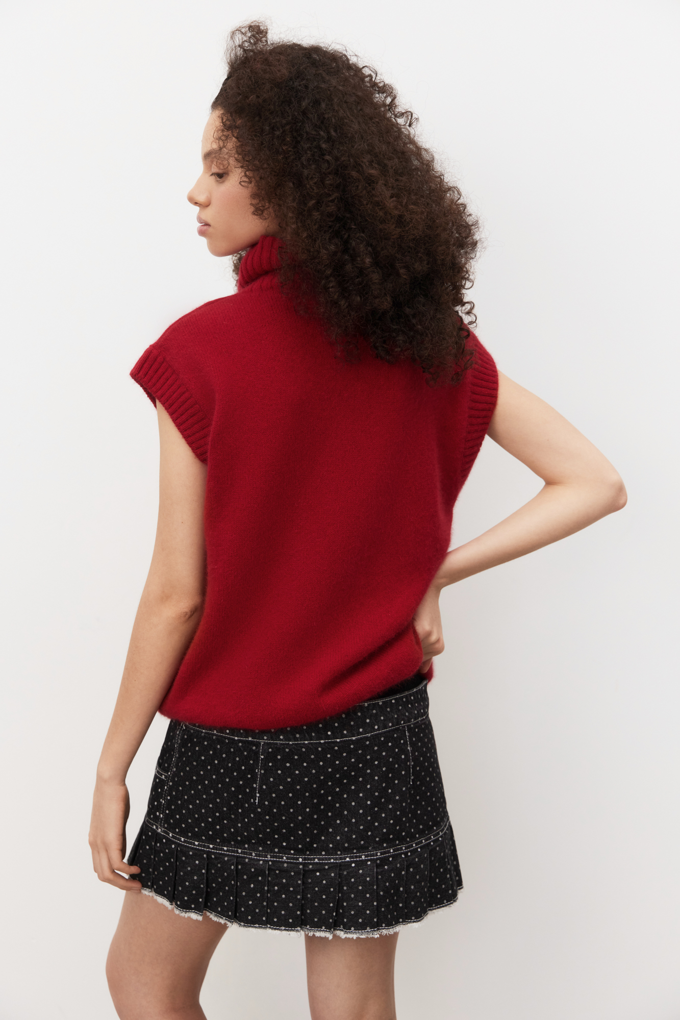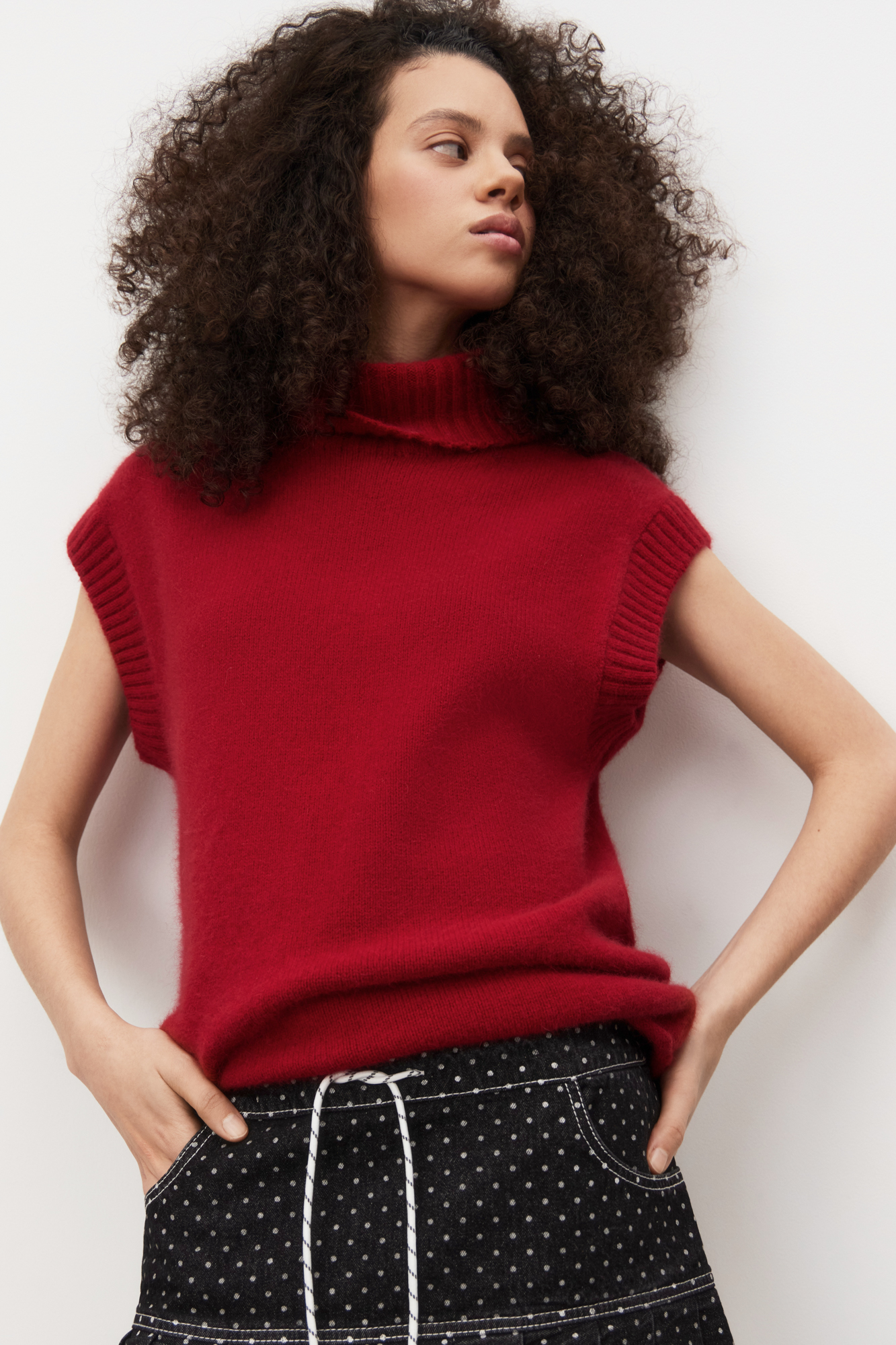 Трикотажный жилет с высоким воротом. Содержание в пряже 40% натурального пуха лисы делает жилет теплым и в тоже время очень легким. Дополнить образ можно юбкой в таком же стиле.