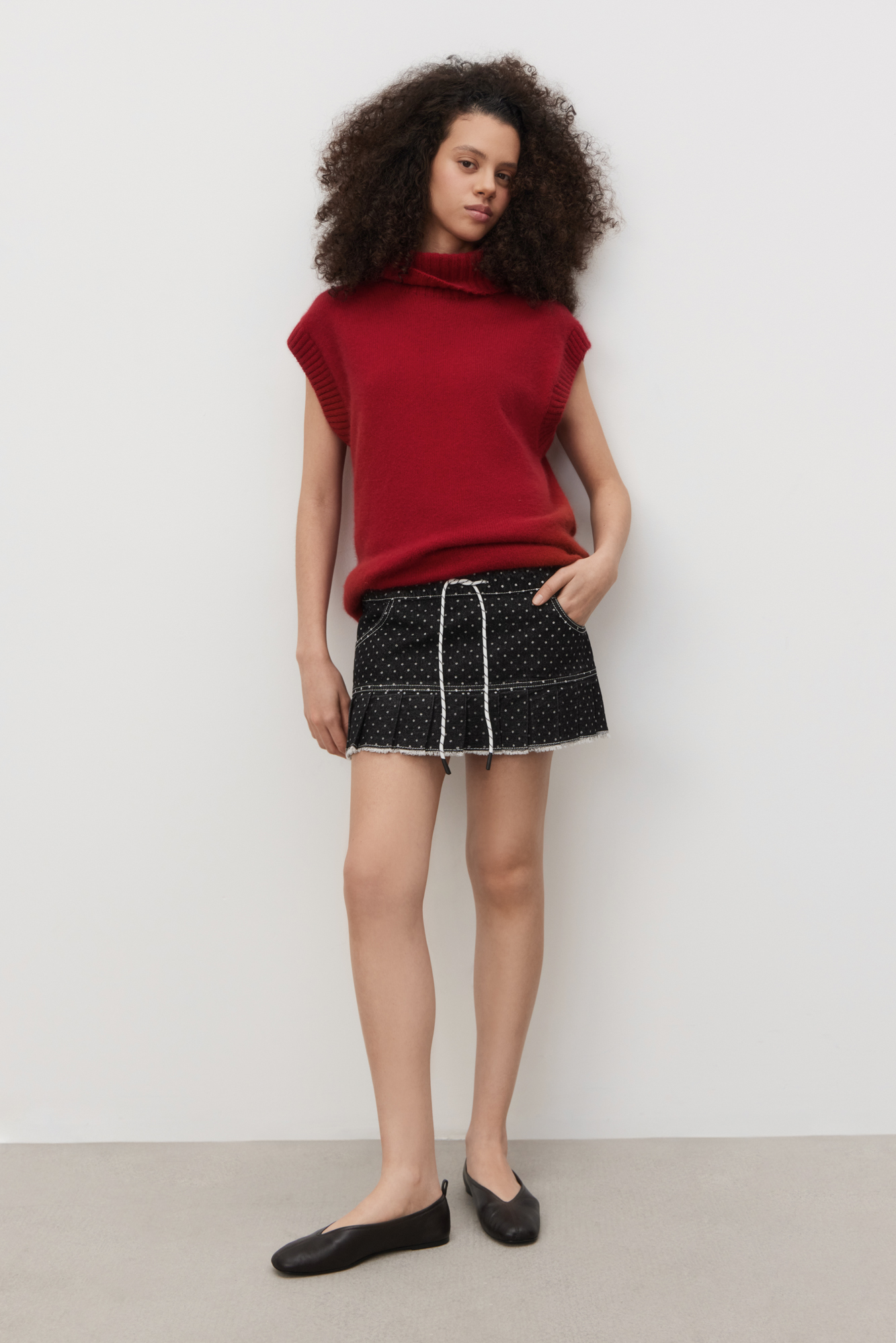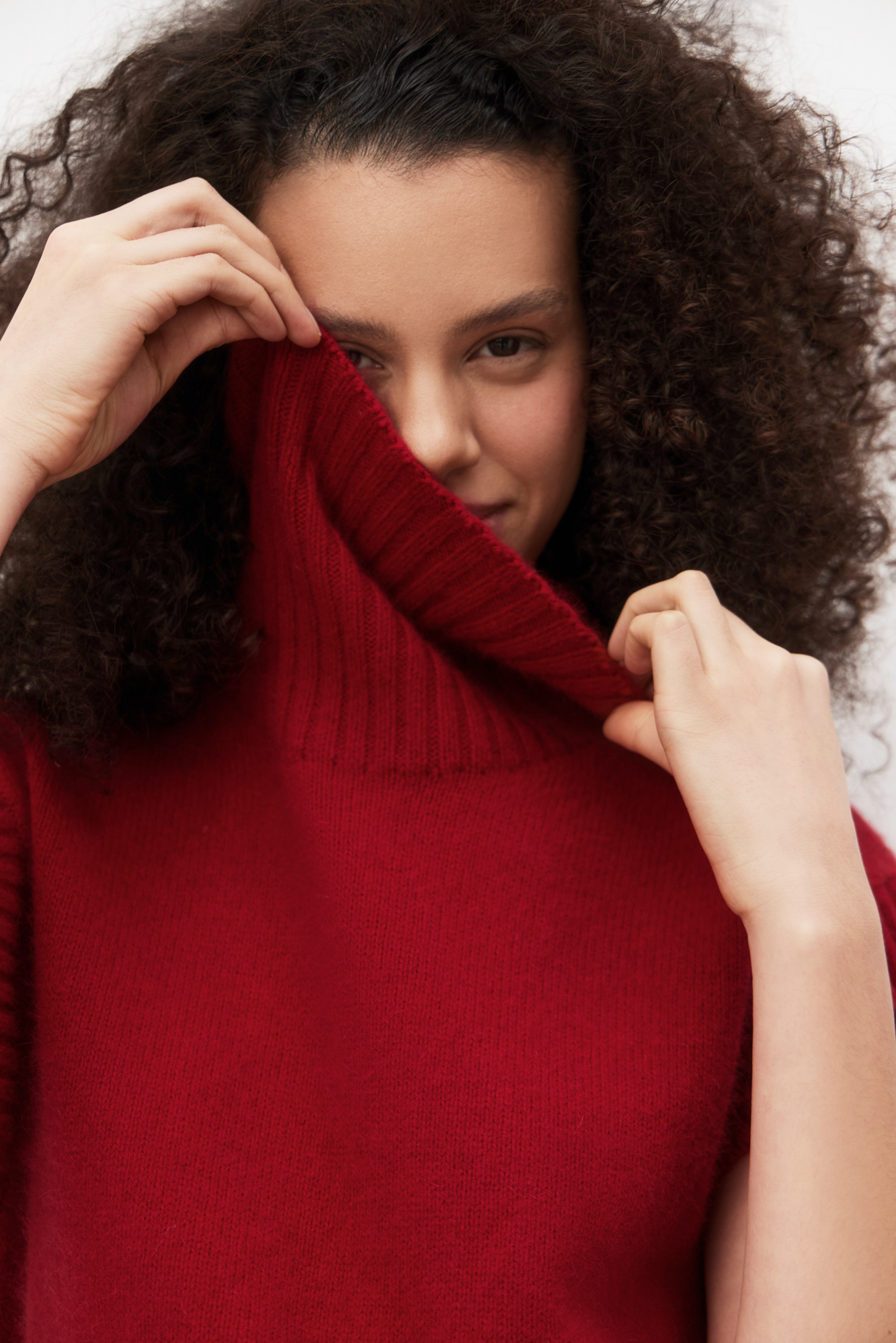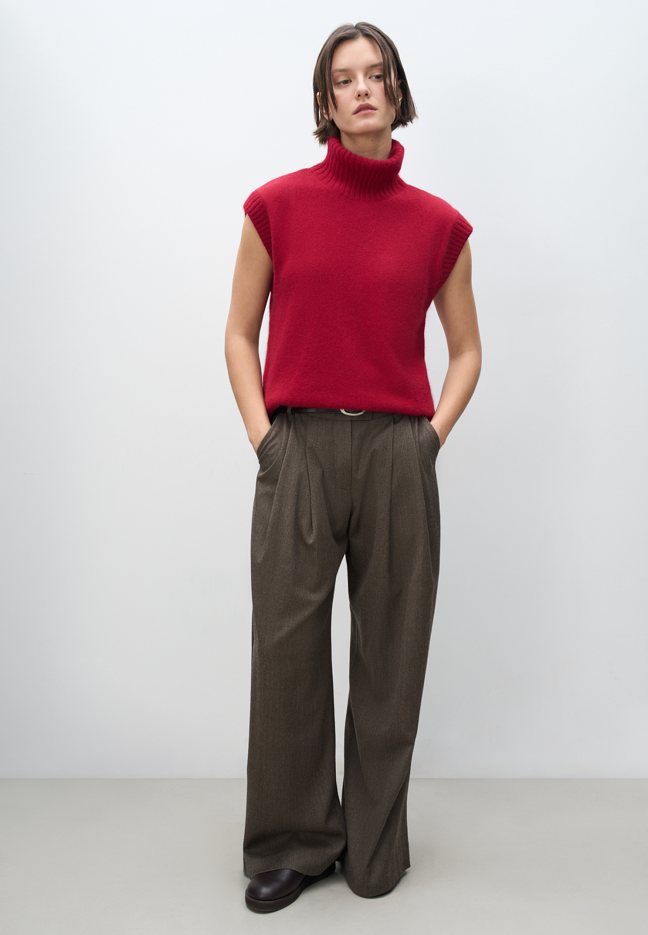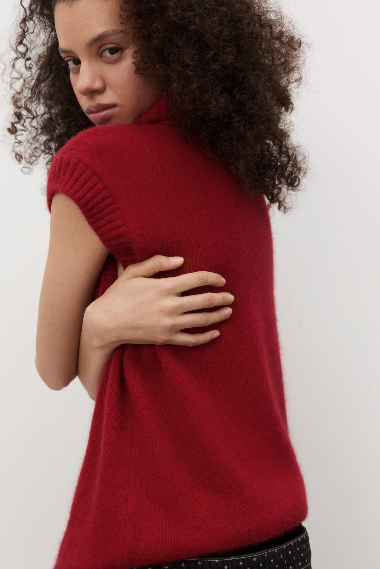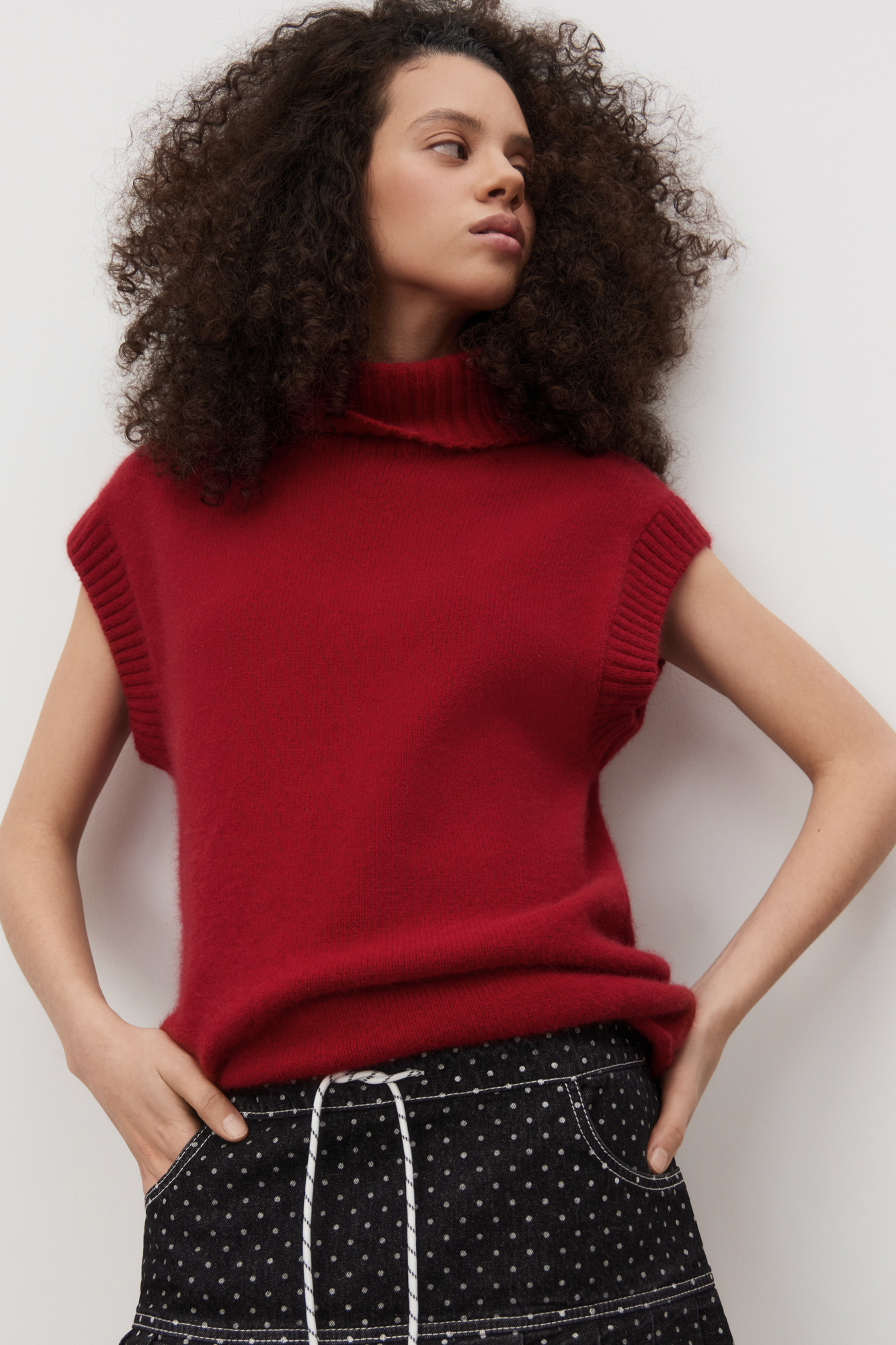 Трикотажный жилет с высоким воротом. Содержание в пряже 40% натурального пуха лисы делает жилет теплым и в тоже время очень легким. Дополнить образ можно юбкой в таком же стиле.