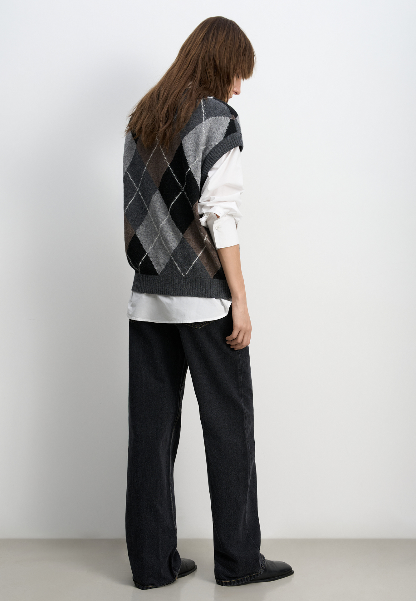 Трикотажный жилет из кашемира с узором аргайл. Модель свободного силуэта без рукавов с неглубоким круглым вырезом горловины. Края изделия выполнены в рубчик.