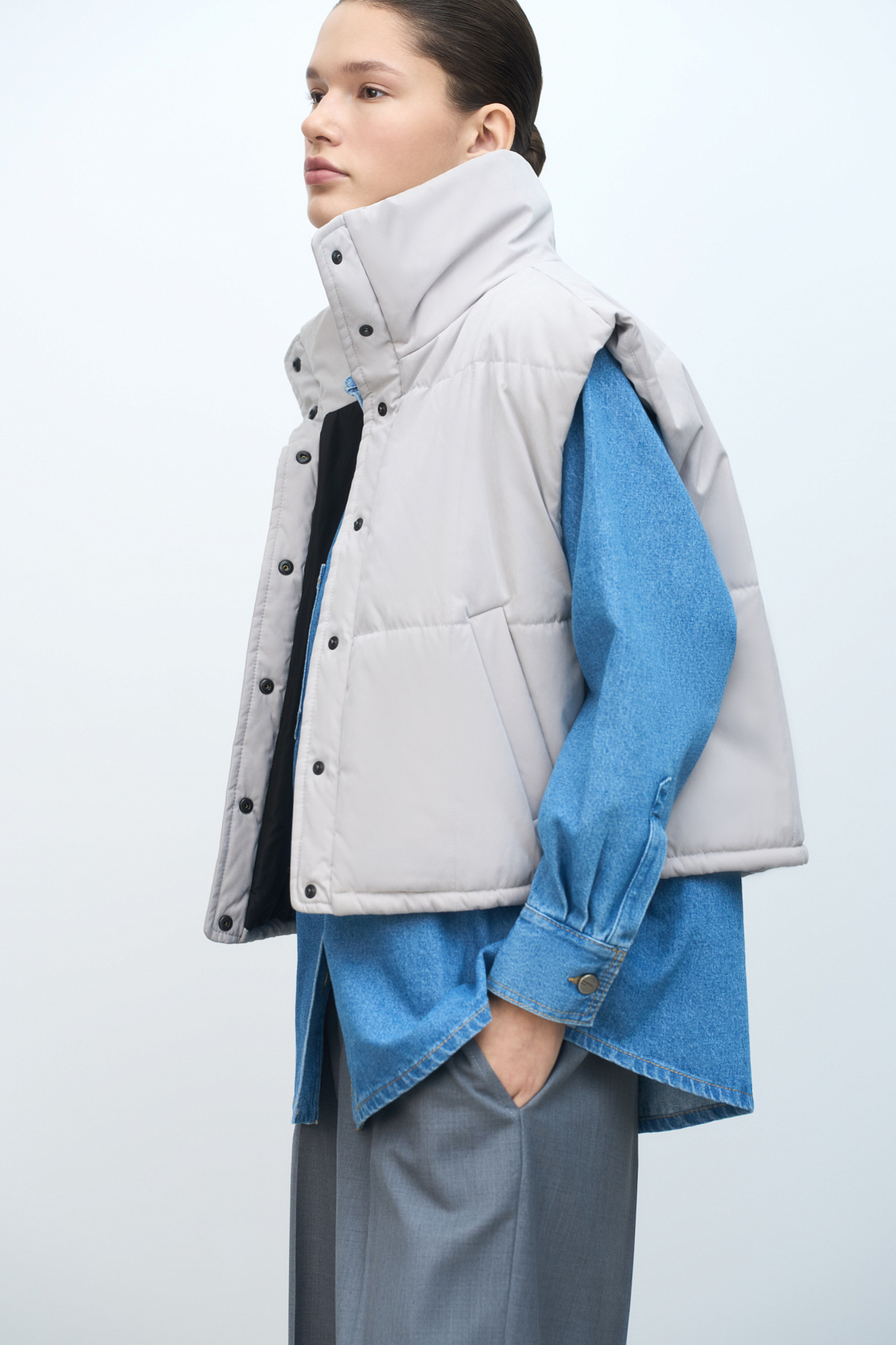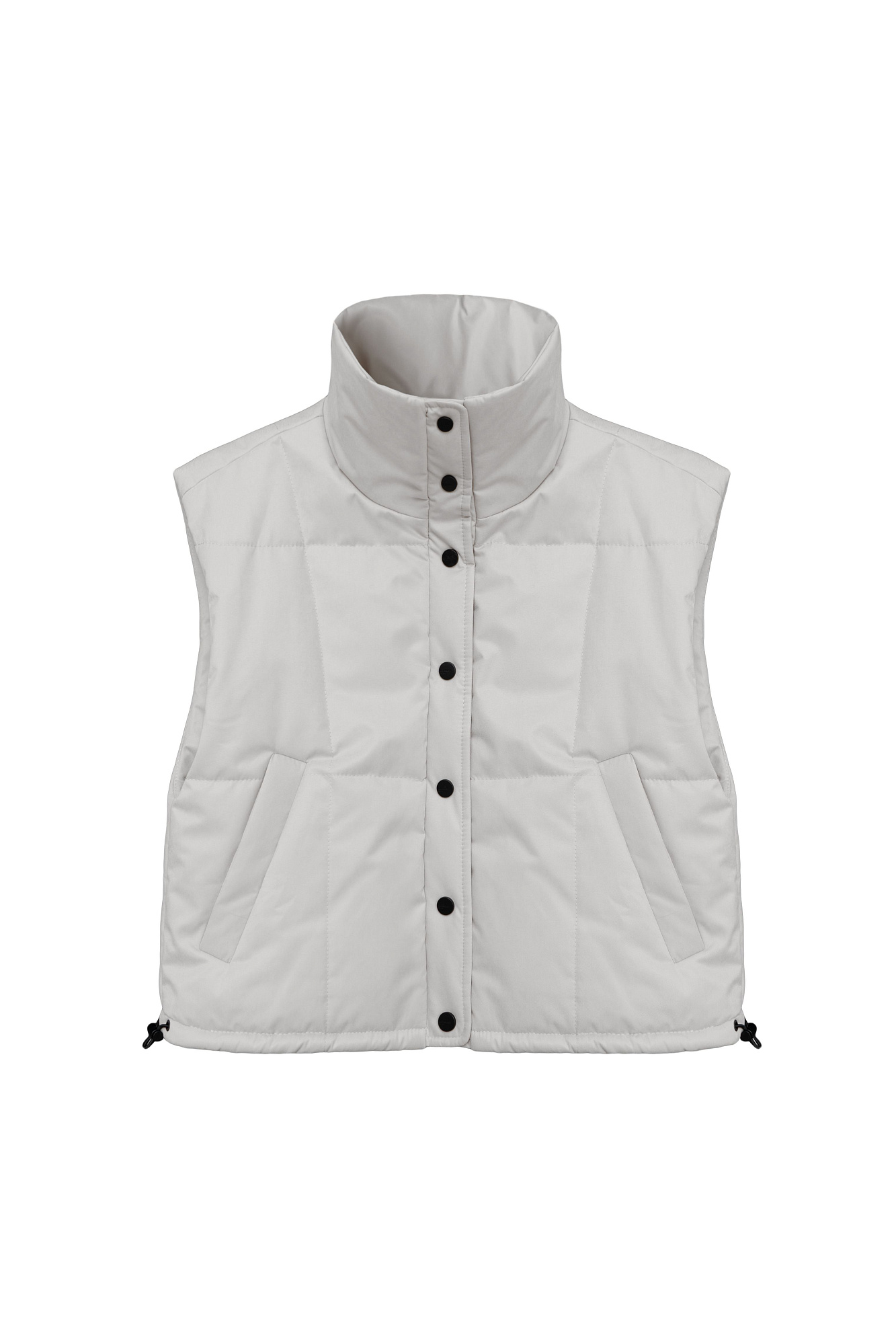 Утепленный жилет с воротником-стойкой. Модель приталенного силуэта с застежкой на кнопки.