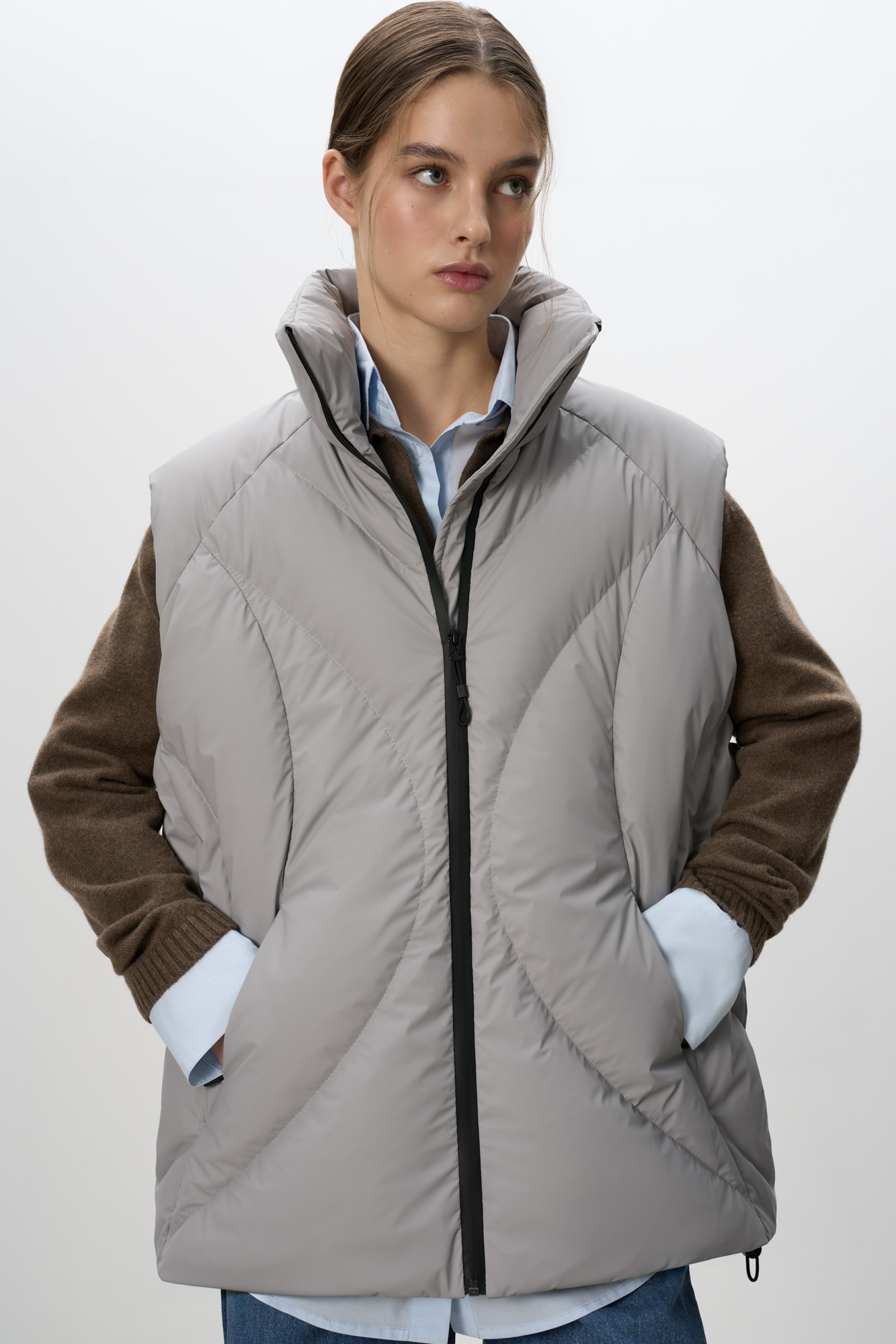 Стеганый жилет на пуху с регулируемой кулиской по краям. Модель свободного силуэта с воротником-стойкой и застежкой на молнию.