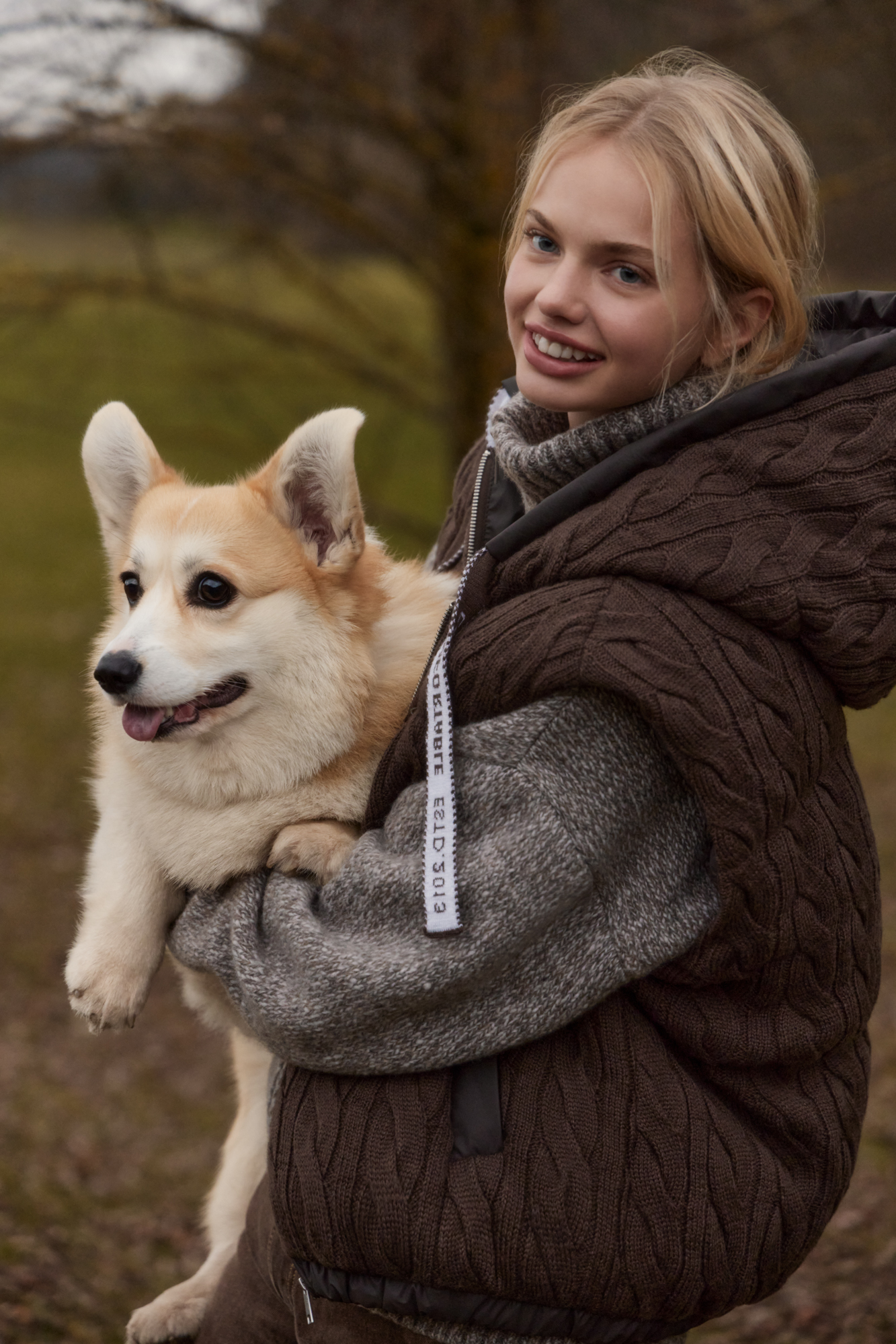 Стеганый жилет на пуху с трикотажным верхом, выполненным объемными косами из мягкой шерсти. Модель прямого кроя, с капюшоном и двумя карманами. Низ изделия выполнен на резинке. На подкладке.