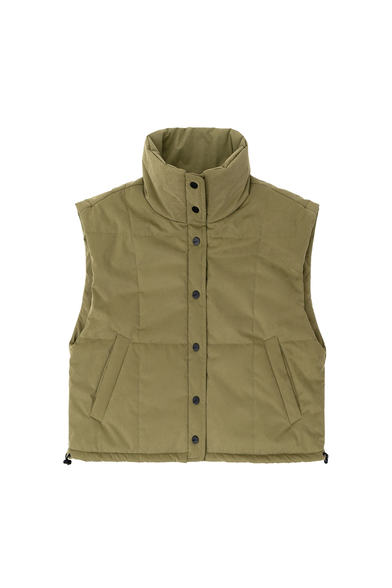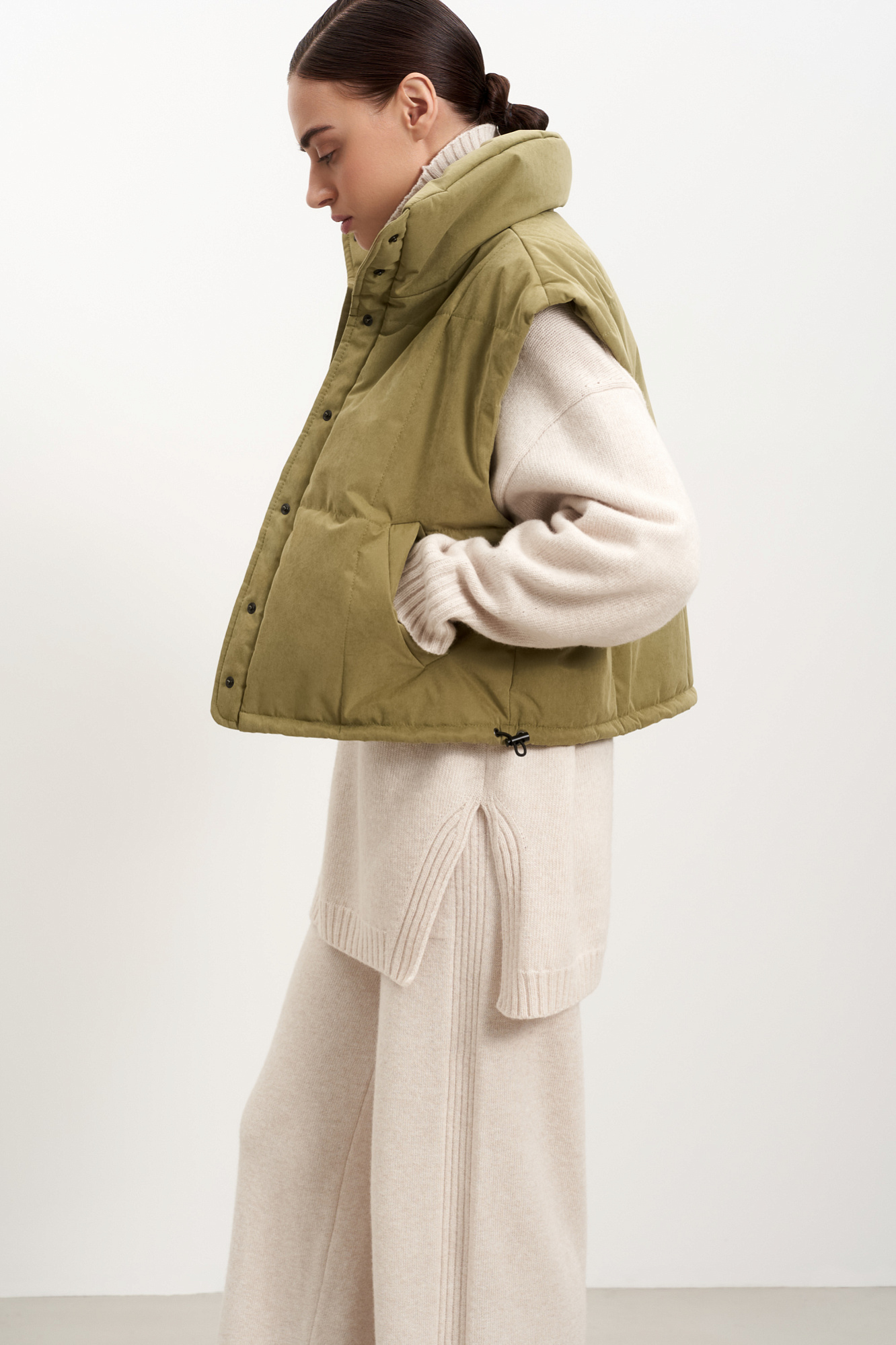 Утепленный жилет с воротником-стойкой. Модель приталенного силуэта с застежкой на кнопки.