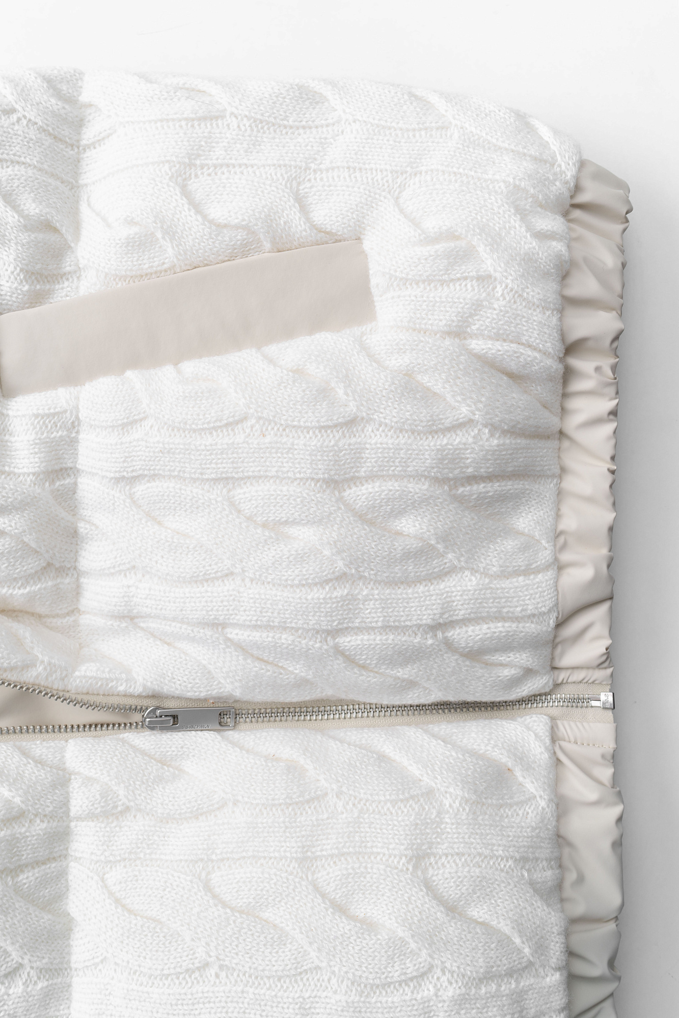 Стеганый жилет на пуху с трикотажным верхом, выполненным объемными косами из мягкой шерсти. Модель прямого кроя, с капюшоном и двумя карманами. Низ изделия выполнен на резинке. На подкладке.
