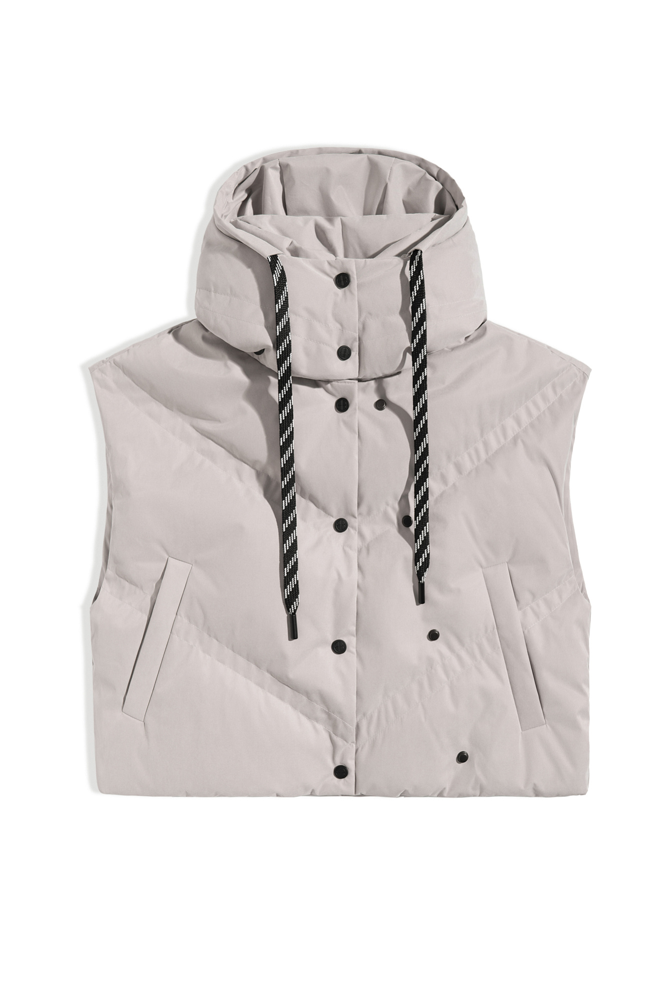 Стеганый жилет на пуху с двойной отстрочкой. Модель с капюшоном и воротником-стойкой. Застежка на кнопки. Низ изделия выполнен на регулируемой кулиске.