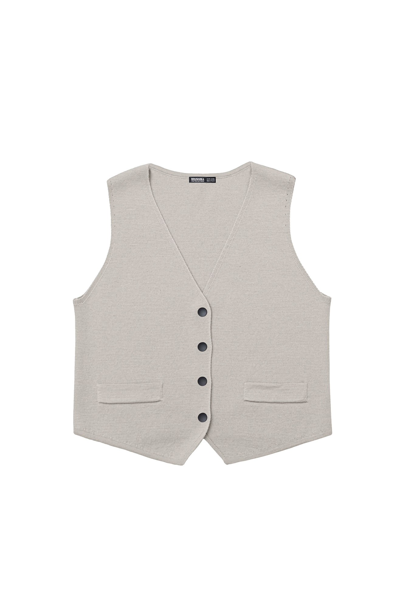 Трикотажный однобортный жилет из шерсти мериноса экстрафайн. Модель прямого кроя с имитацией карманов с клапанами и V-образным вырезом. Застежка на кнопки. Изделие без подкладки. Дополнить образ можно жакетом, бомбером, брюками или юбкой.