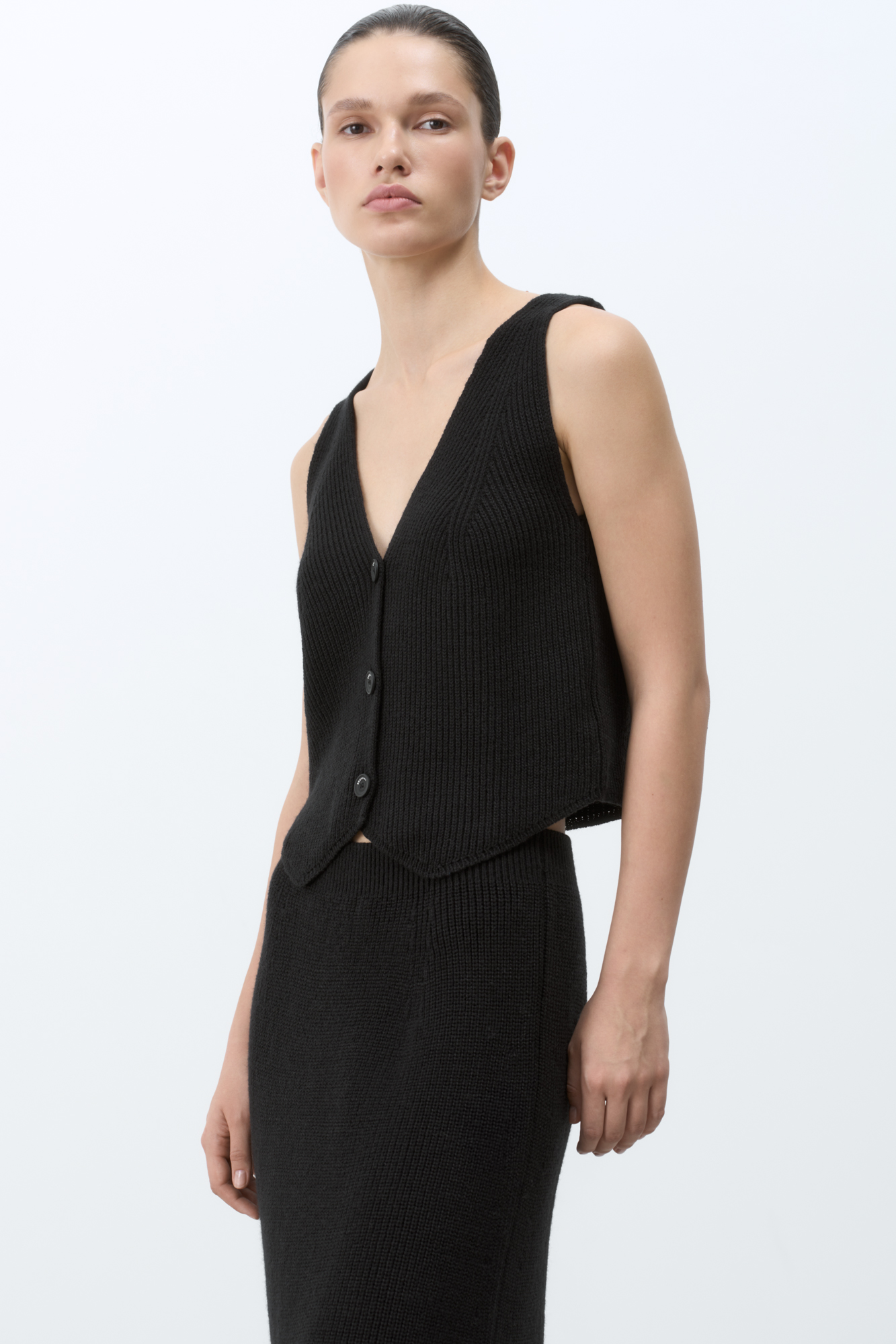 Трикотажный жилет из шерсти. Модель прямого кроя с глубоким V-образным вырезом и застежкой на пуговицы. Дополнить образ можно юбкой в таком же стиле.