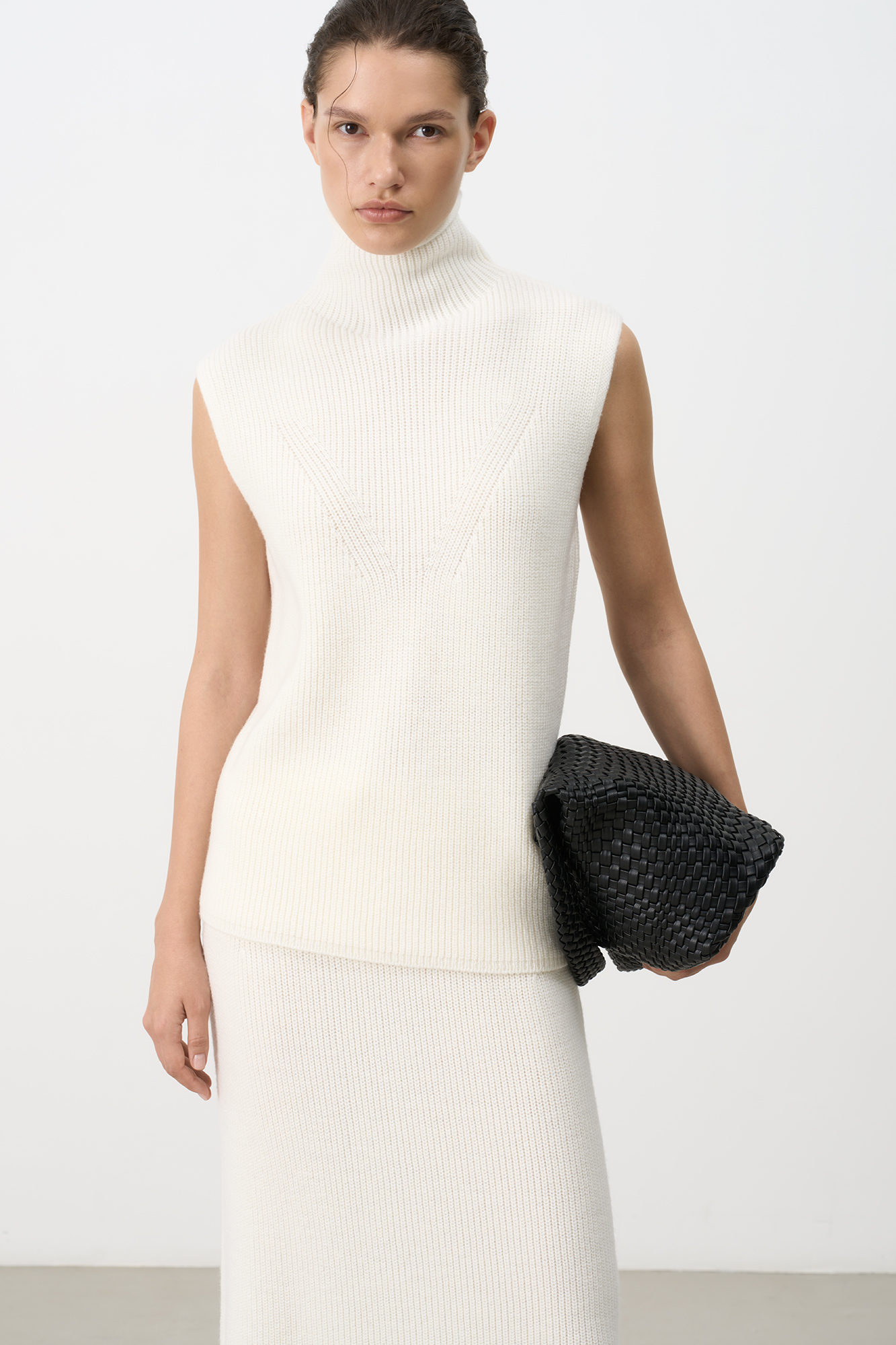Трикотажный жилет из шерсти с добавлением акрила. Модель прямого силуэта, без рукавов, с декоративными сбавками на груди и высоким воротником с валиком. Дополнить образ можно юбкой в таком же стиле.