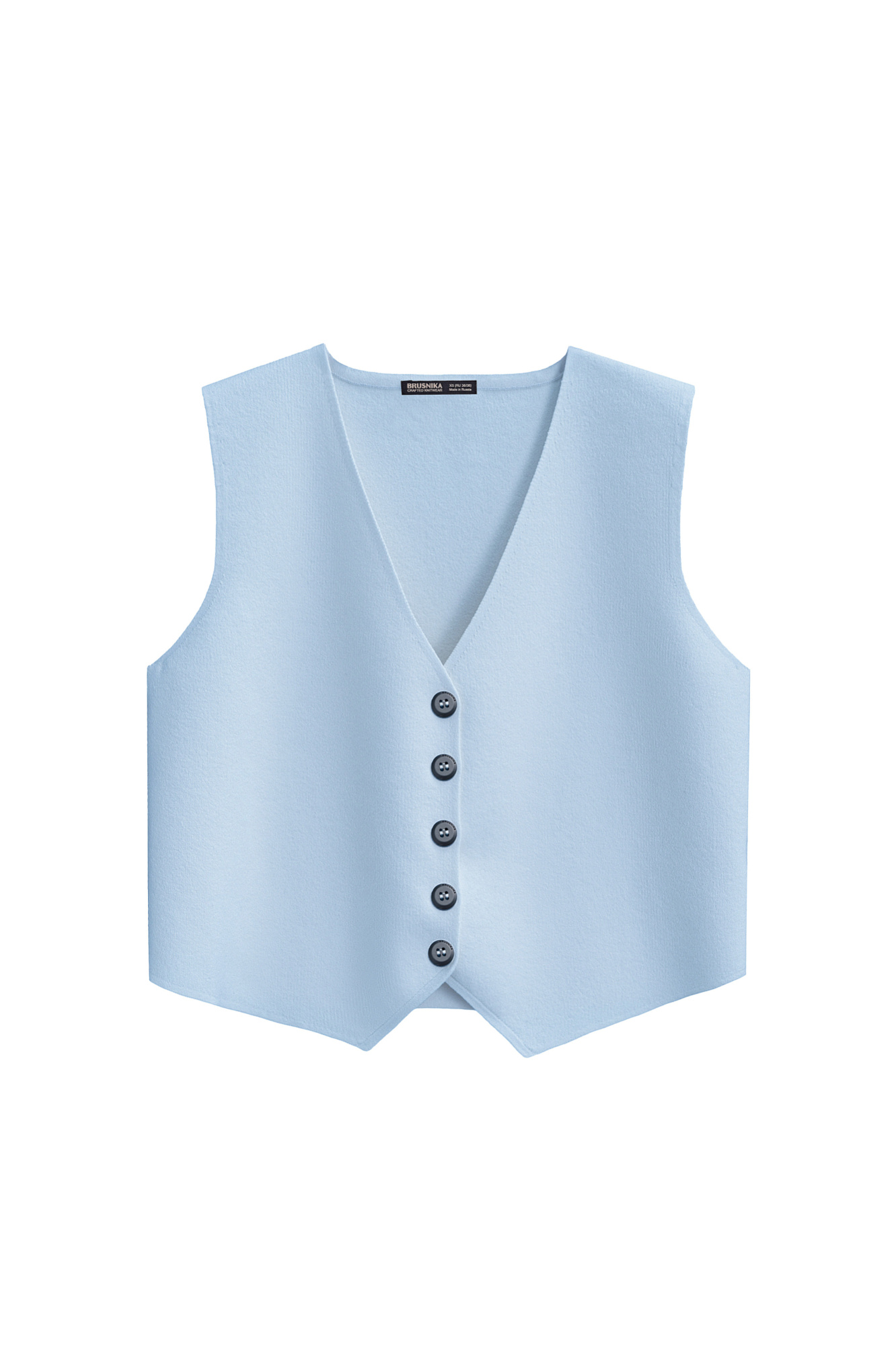 Трикотажный жилет из вискозы. Модель прямого кроя с V-образным вырезом и застежкой на пуговицы.
