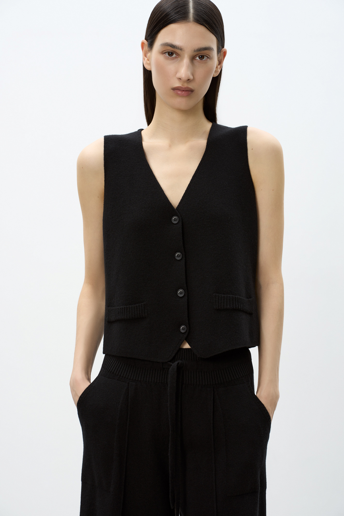Трикотажный жилет из смесовой шерсти с кашемиром. Модель прямого кроя с V-образным вырезом и застежкой на пуговицы. Имитация карманов. Без подкладки.