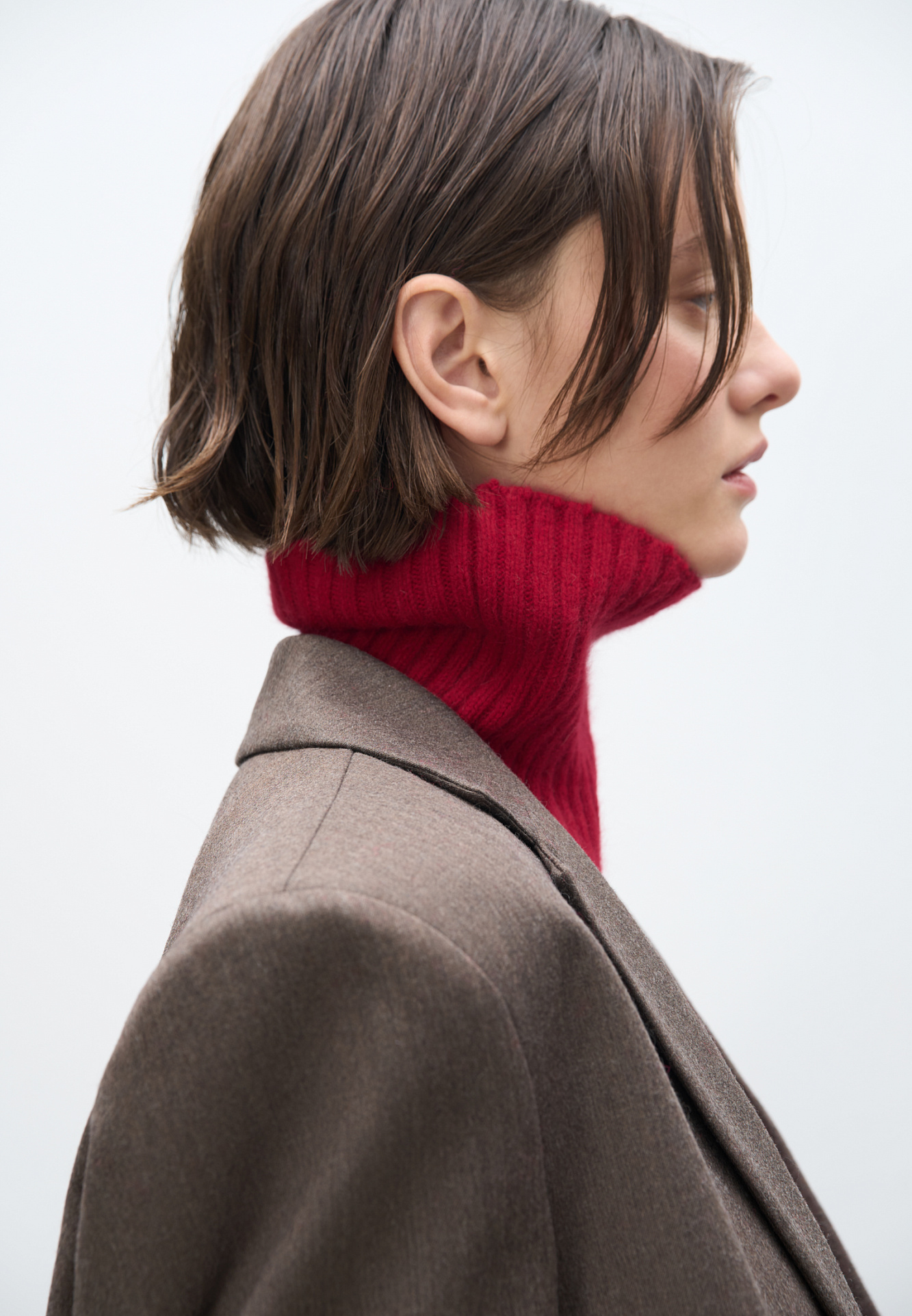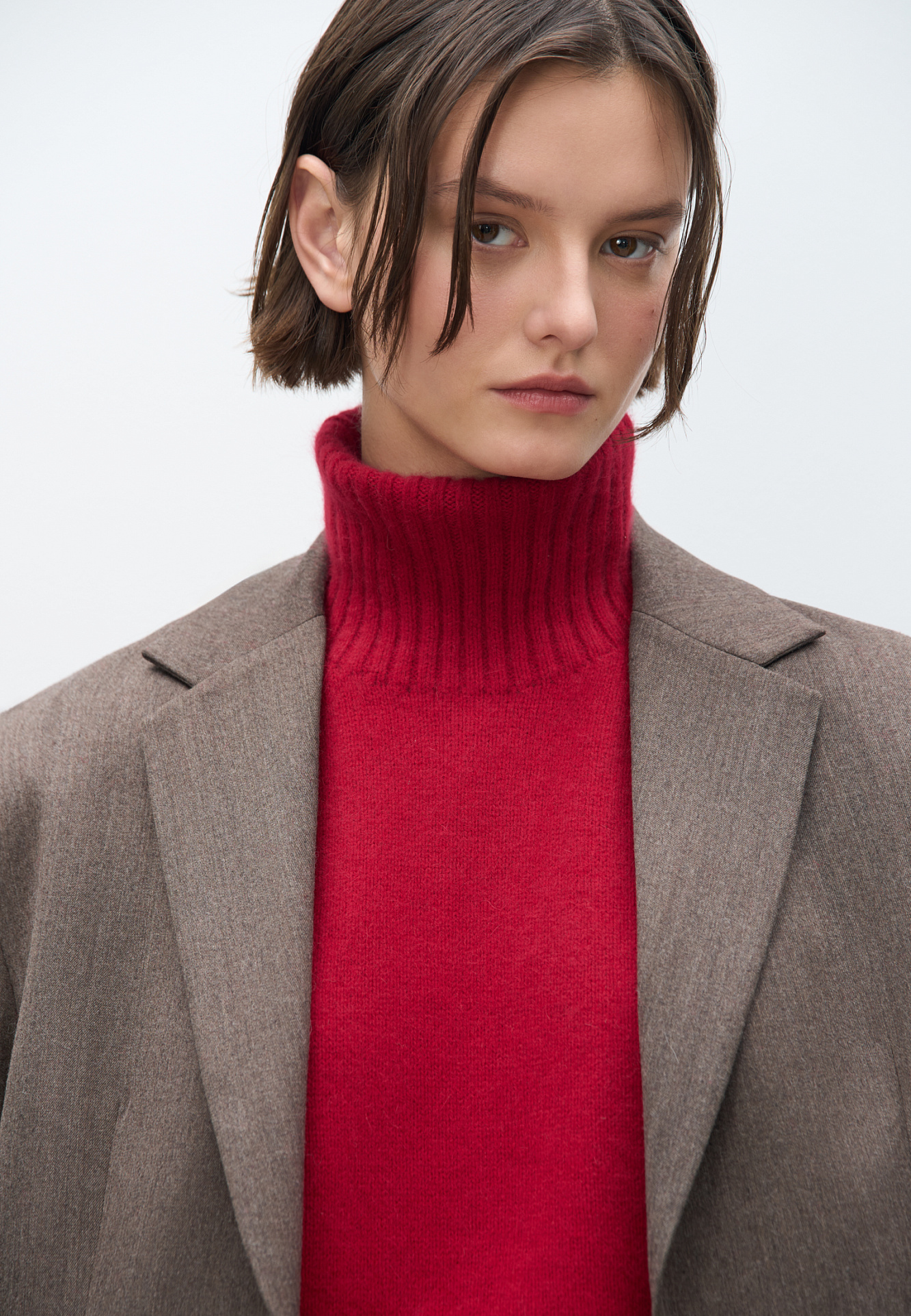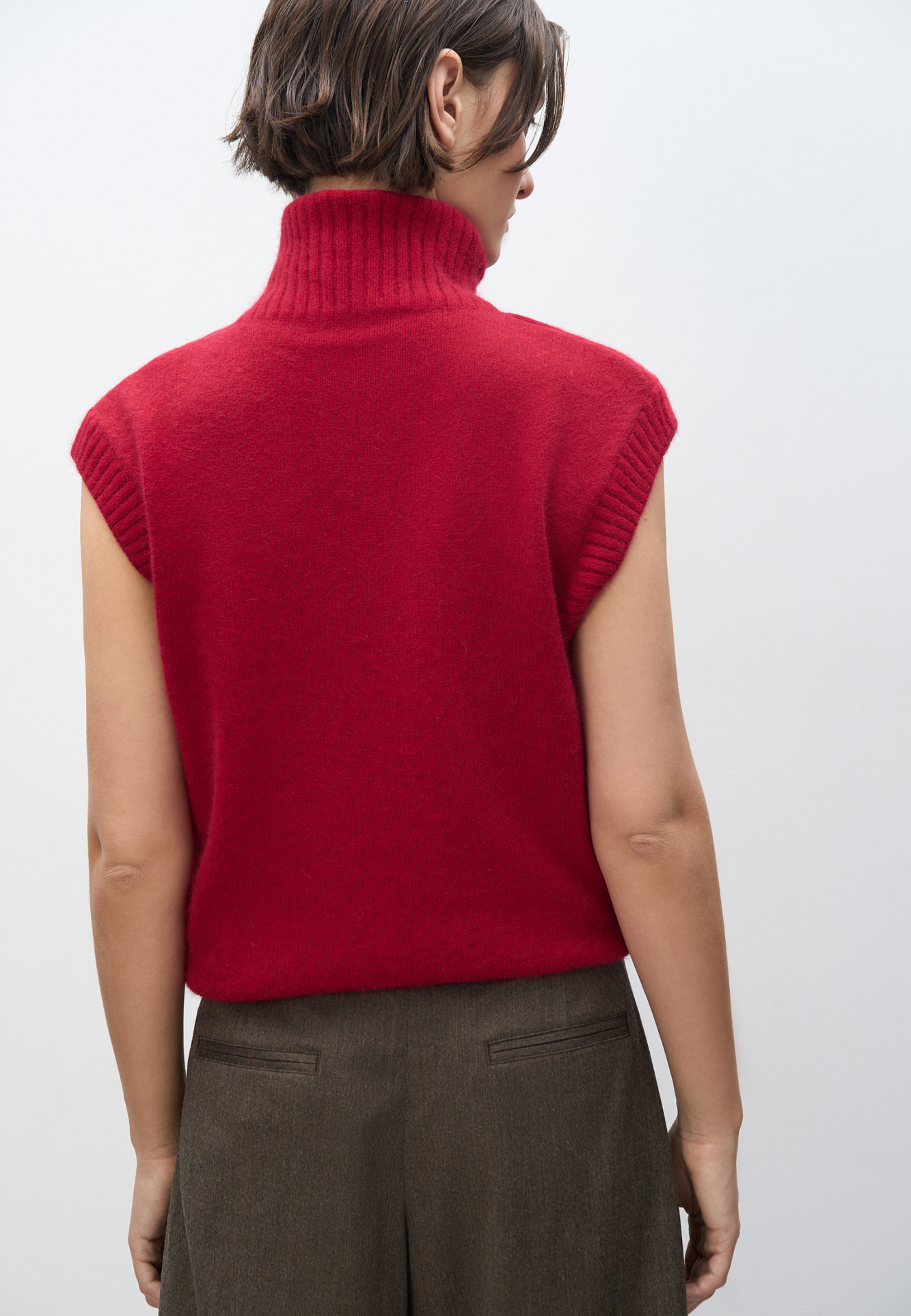 Трикотажный жилет с высоким воротом. Содержание в пряже 40% натурального пуха лисы делает жилет теплым и в тоже время очень легким. Дополнить образ можно юбкой в таком же стиле.