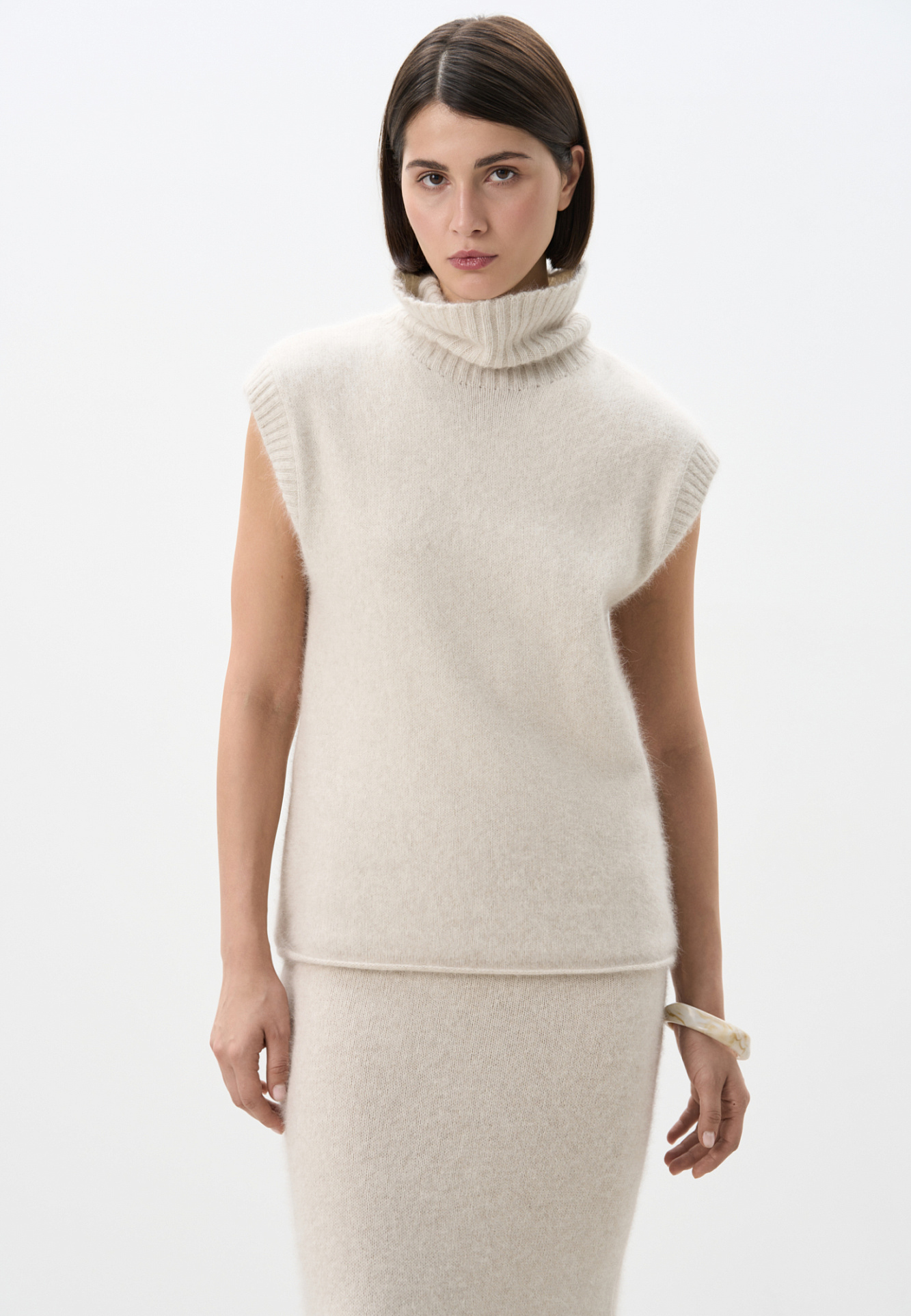 Трикотажный жилет с высоким воротом. Содержание в пряже 40% натурального пуха лисы делает жилет теплым и в тоже время очень легким. Дополнить образ можно юбкой в таком же стиле.