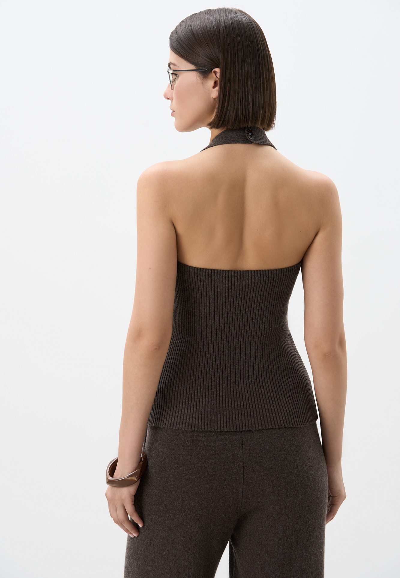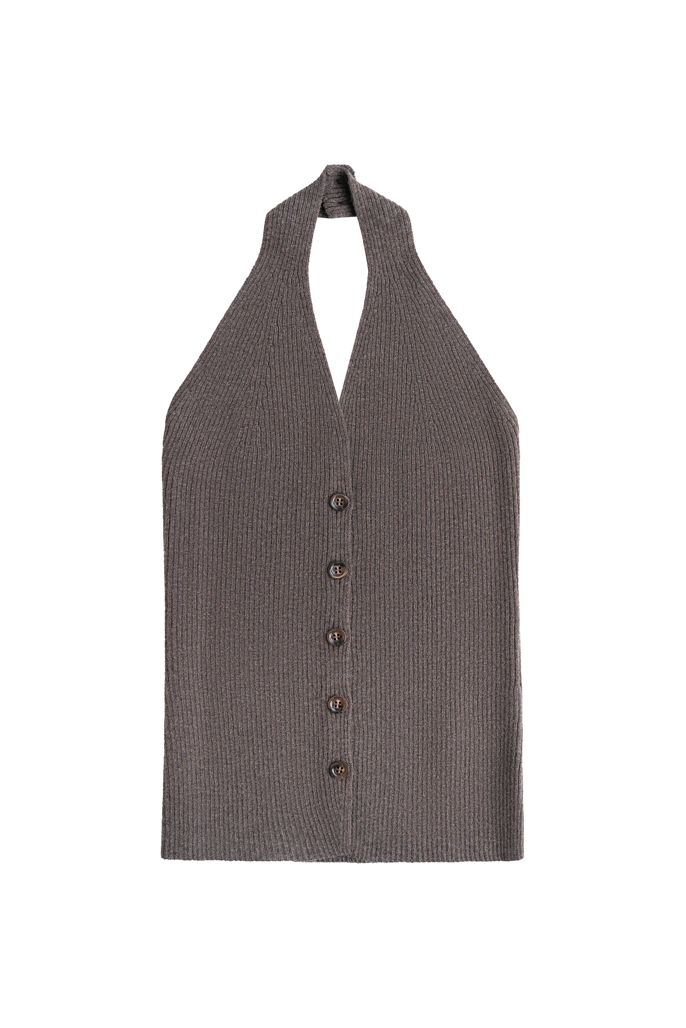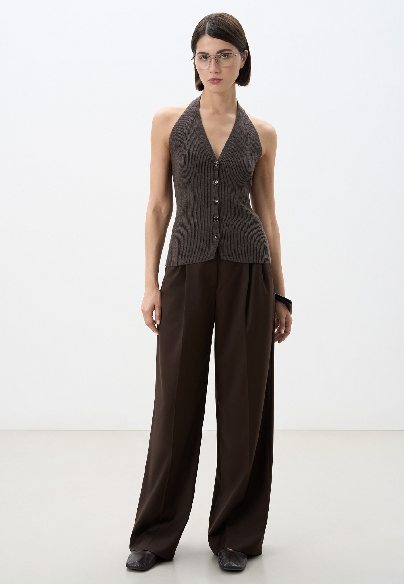 Трикотажный жилет в рубчик из шерсти и кашемира. Модель по фигуре с V-образным вырезом и американской проймой. Застежка на пуговицы.