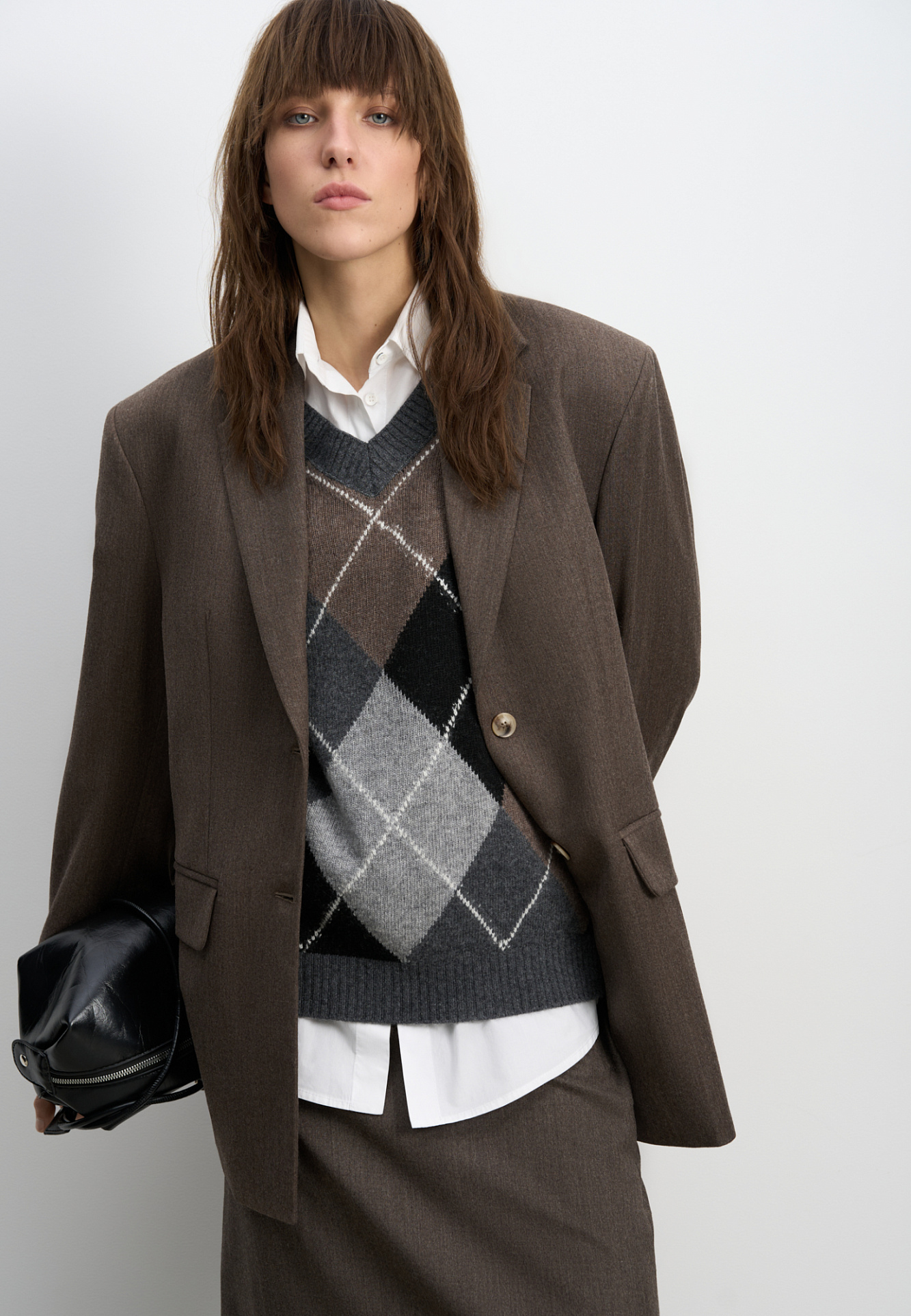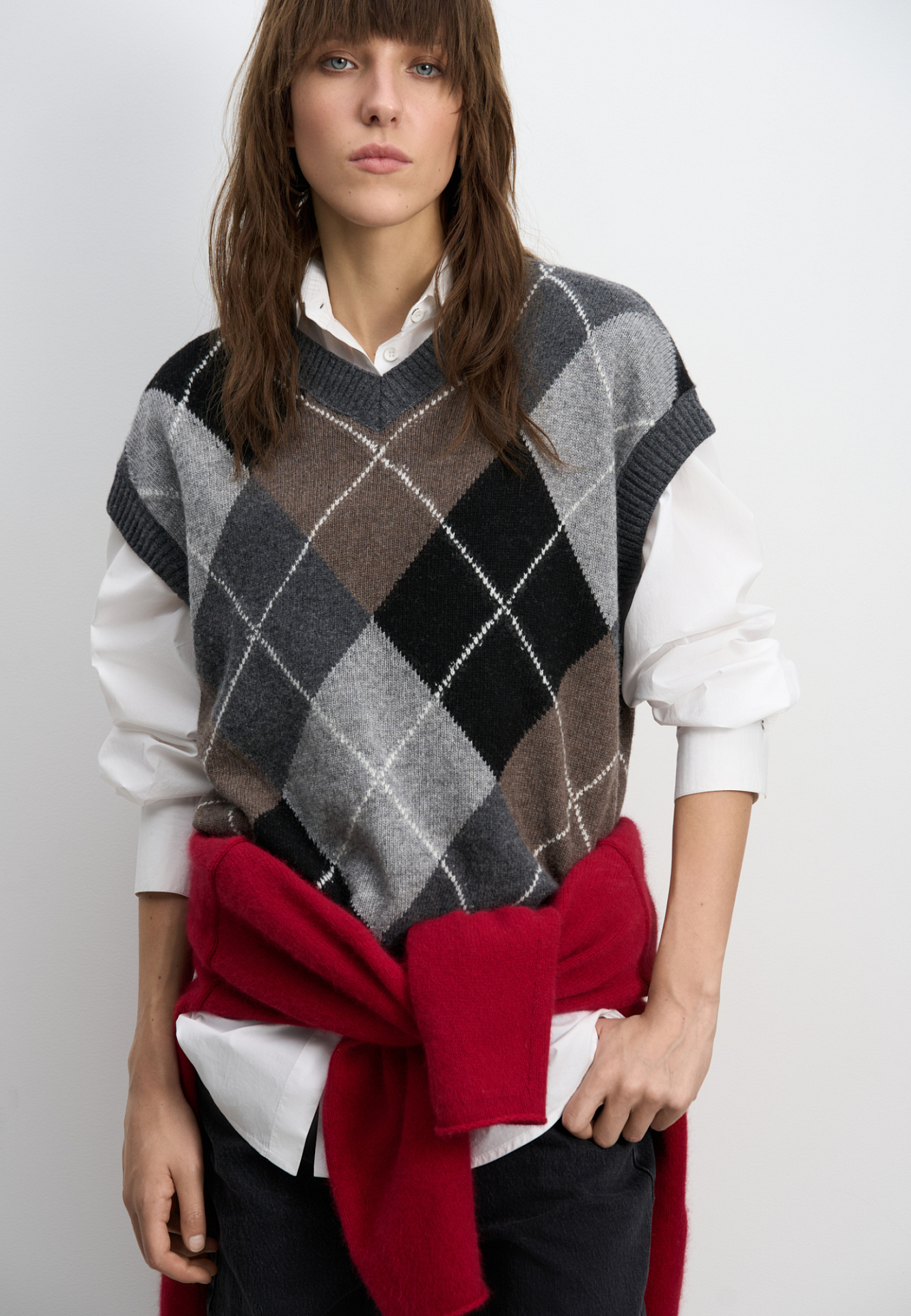 Трикотажный жилет из кашемира с узором аргайл. Модель свободного силуэта без рукавов с неглубоким V-образным вырезом горловины. Края изделия выполнены в рубчик.